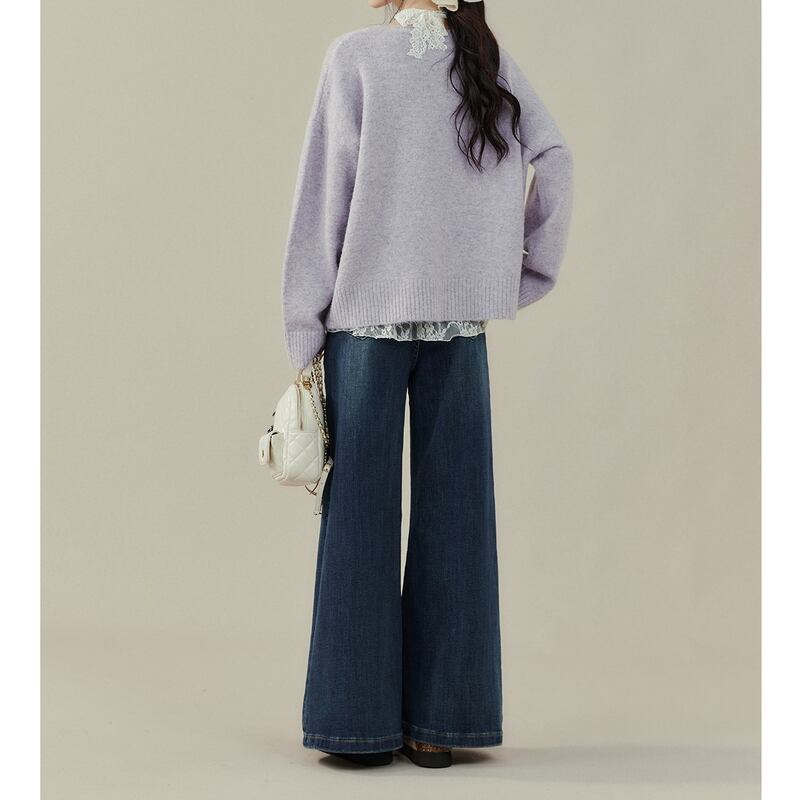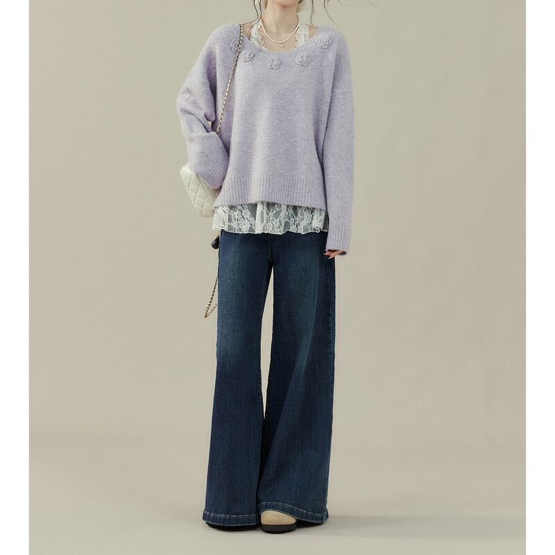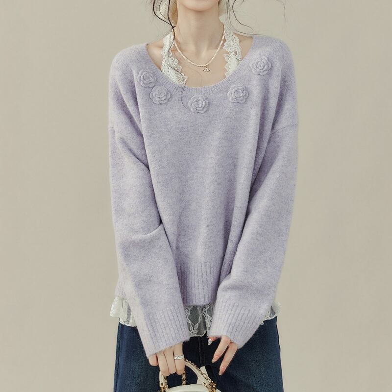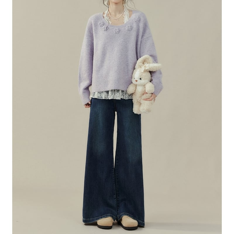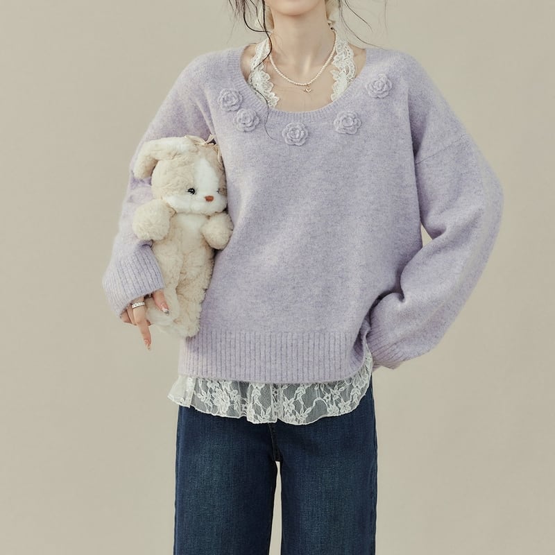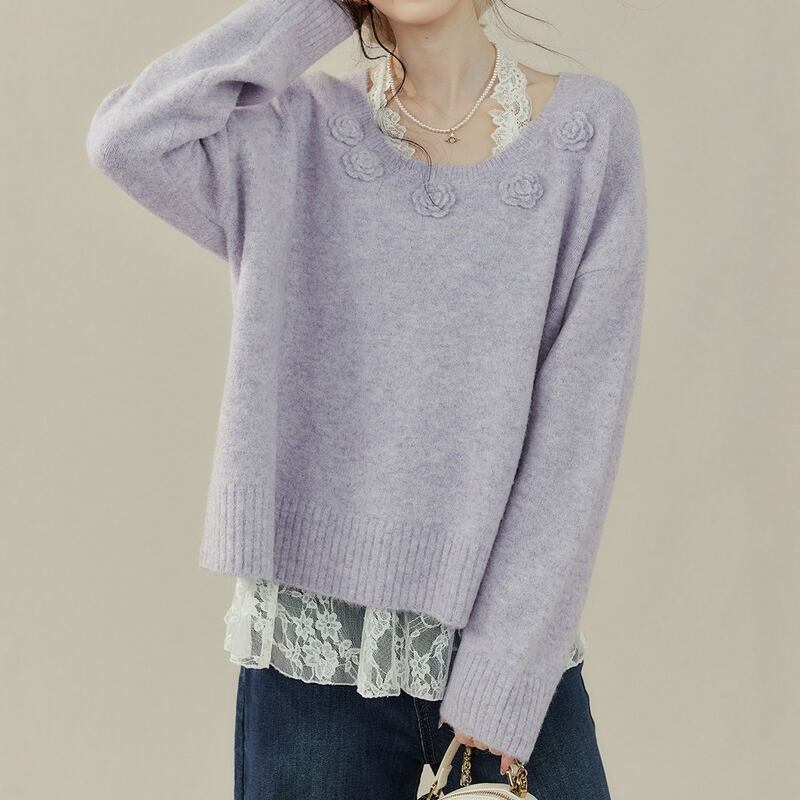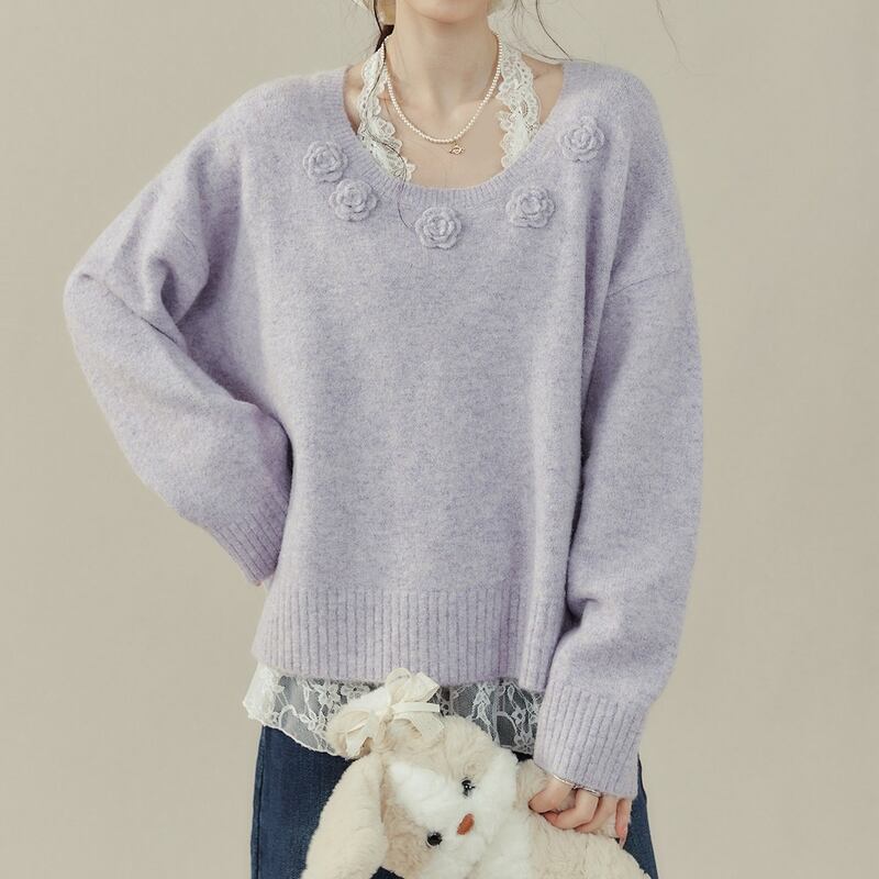 首元に施されたフラワーモチーフがポイントのニットトップスです。