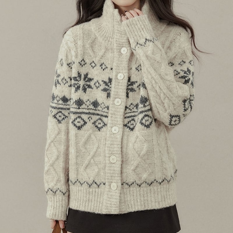 ケーブル編みがアクセントになった、スタンドカラーのニットカーディガンです。