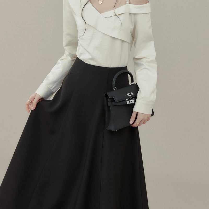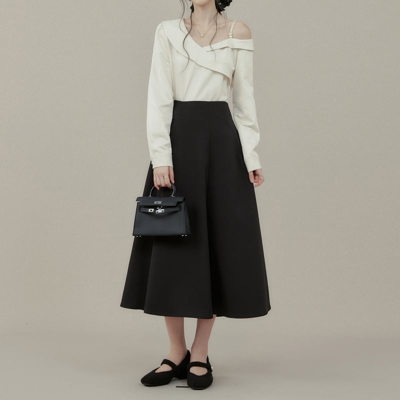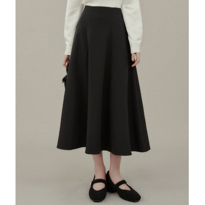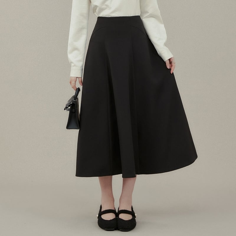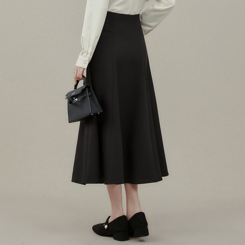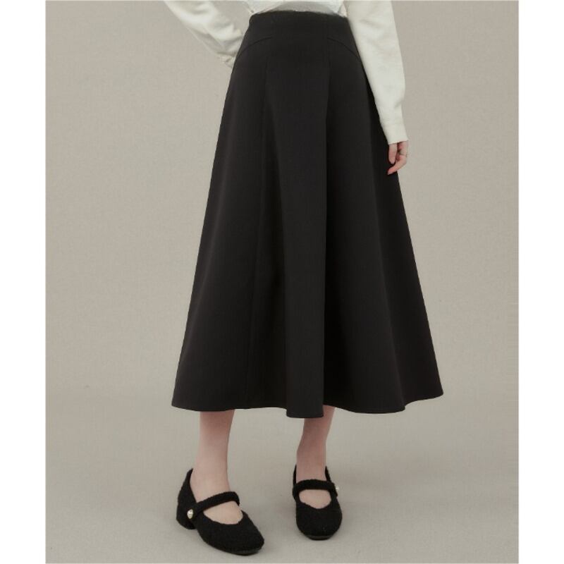 上品なAラインシルエットが魅力的な切り替えミモレ丈スカートです。