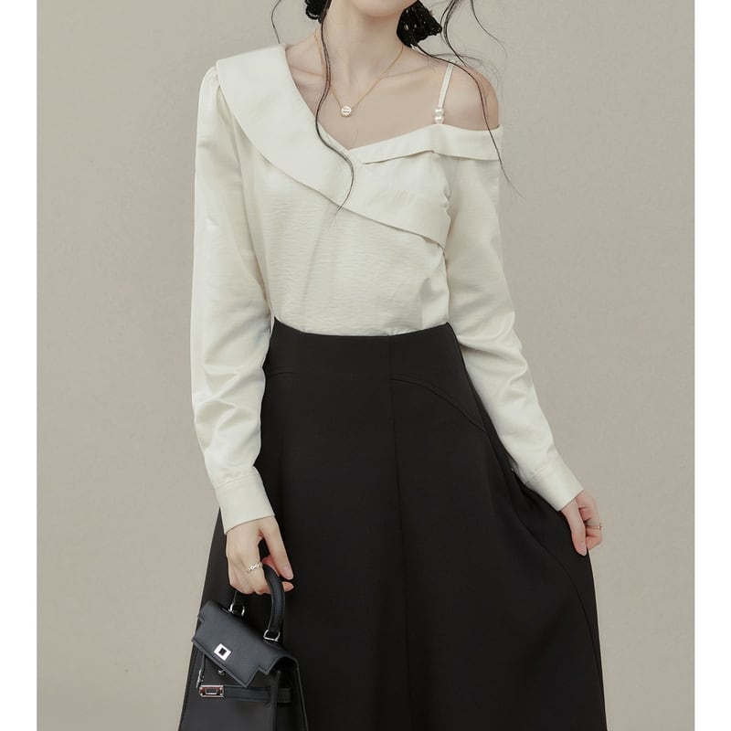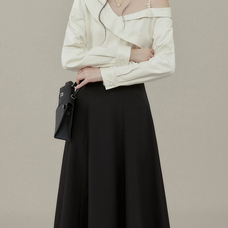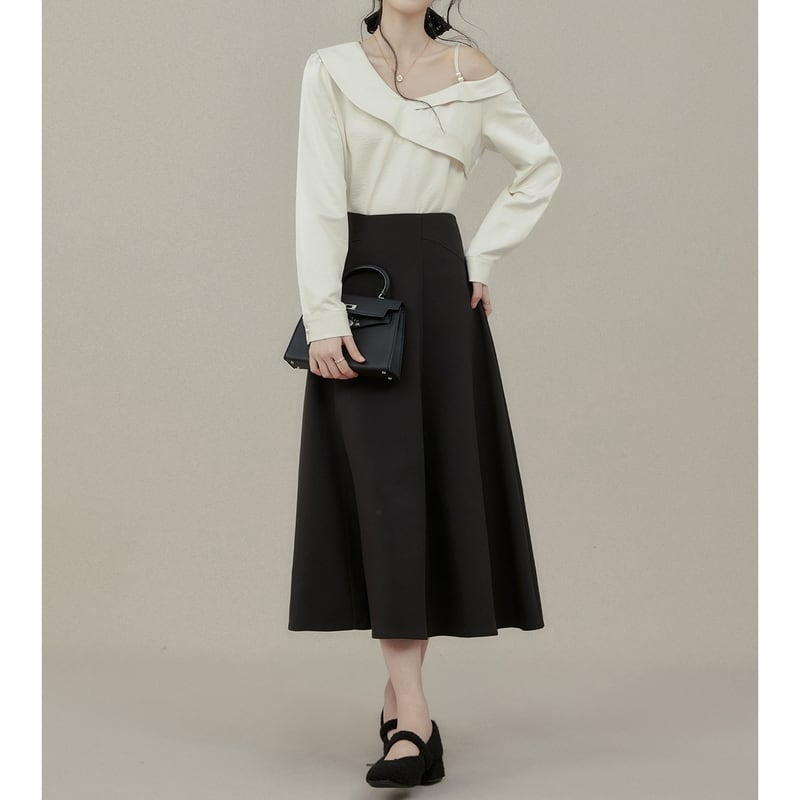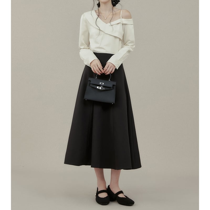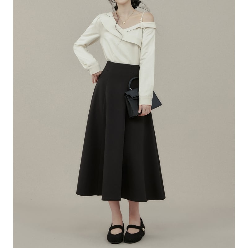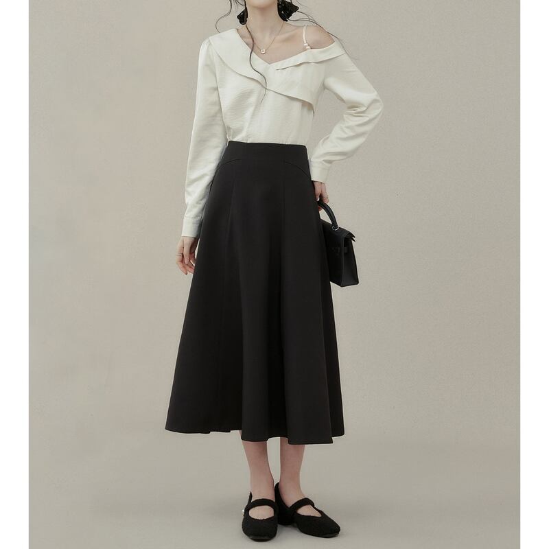 上品なAラインシルエットが魅力的な切り替えミモレ丈スカートです。