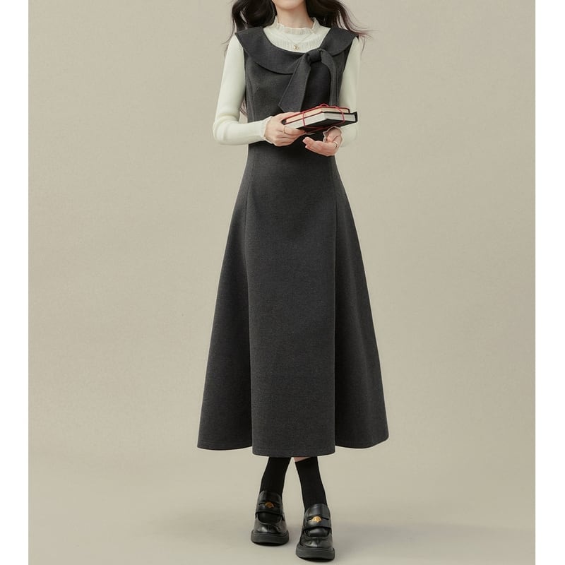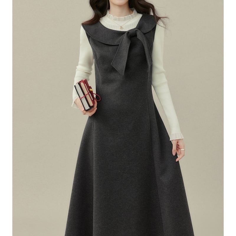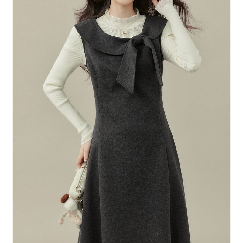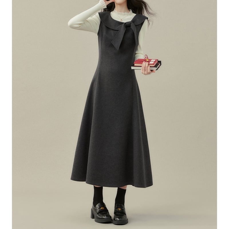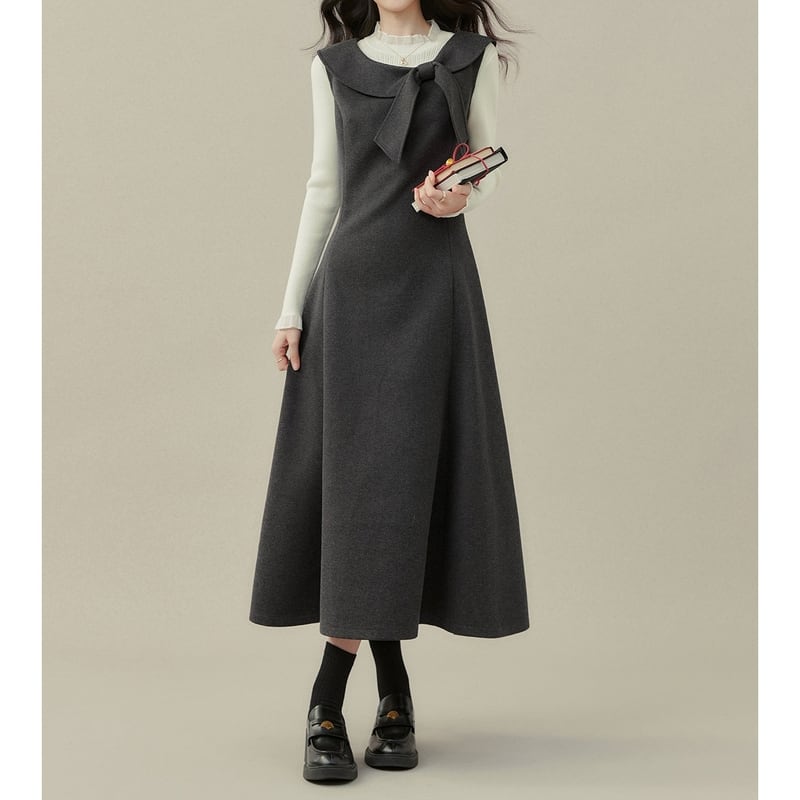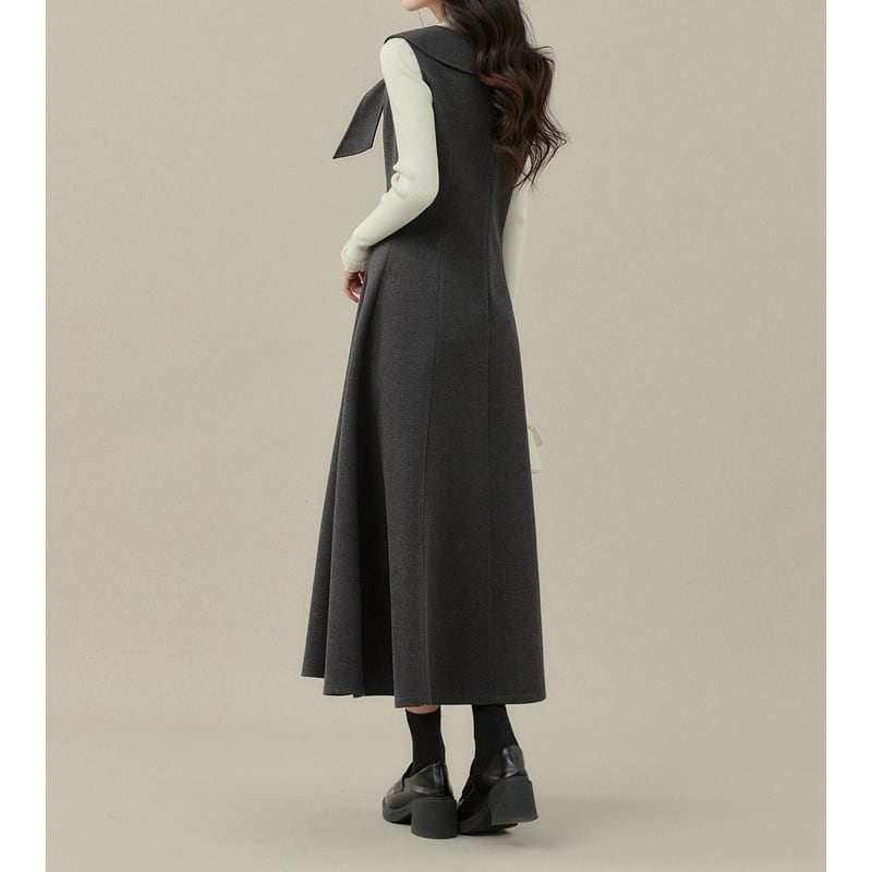 上品なリボン付き襟がアクセントになった、クラシカルな雰囲気のノースリーブワンピースです。