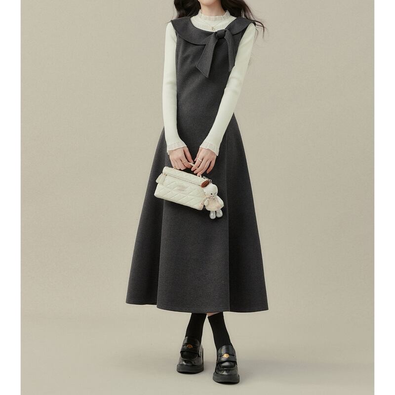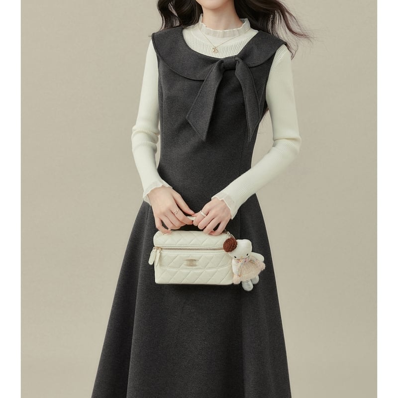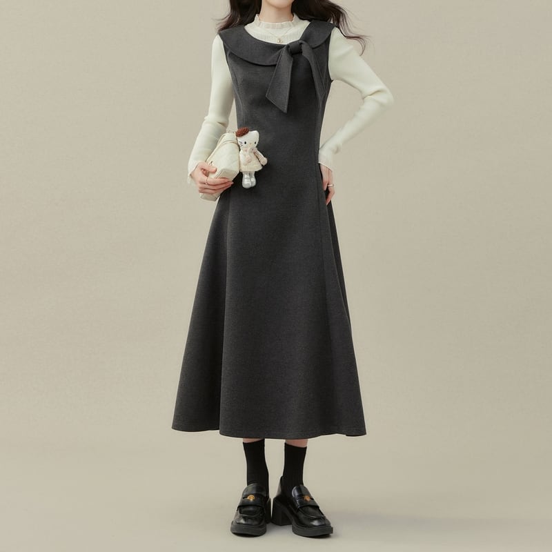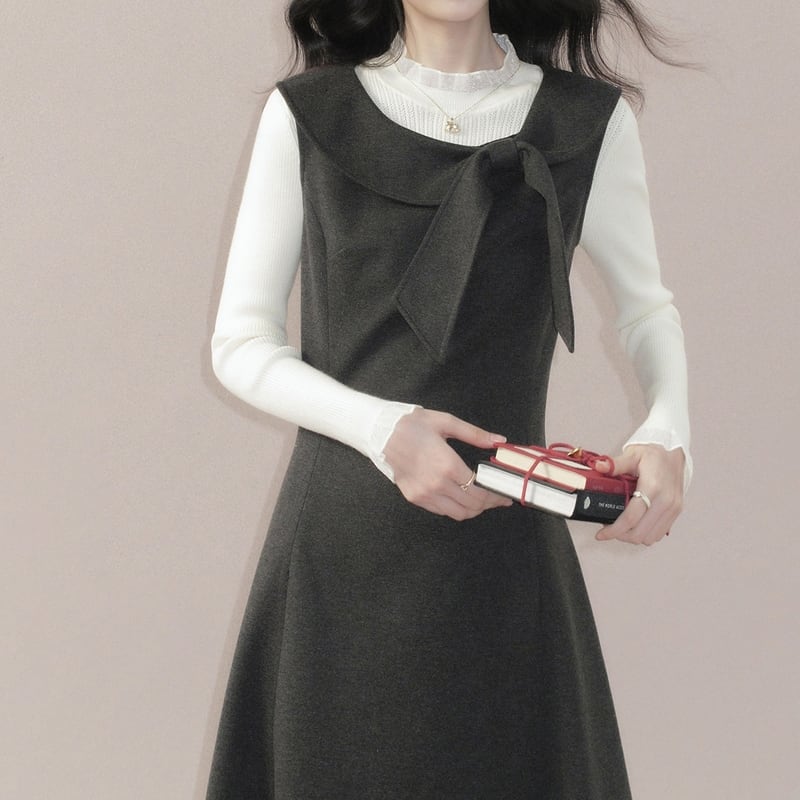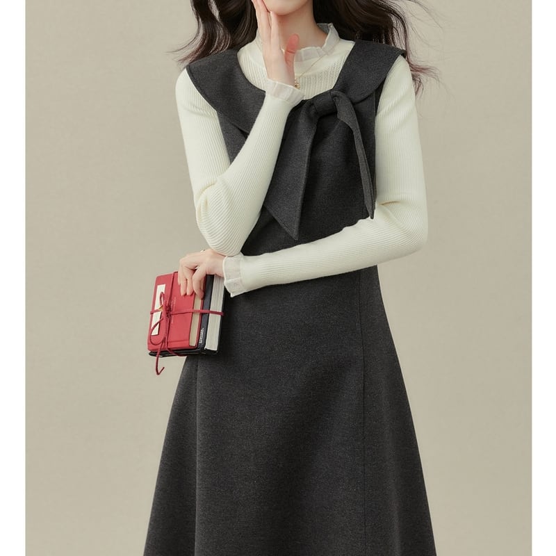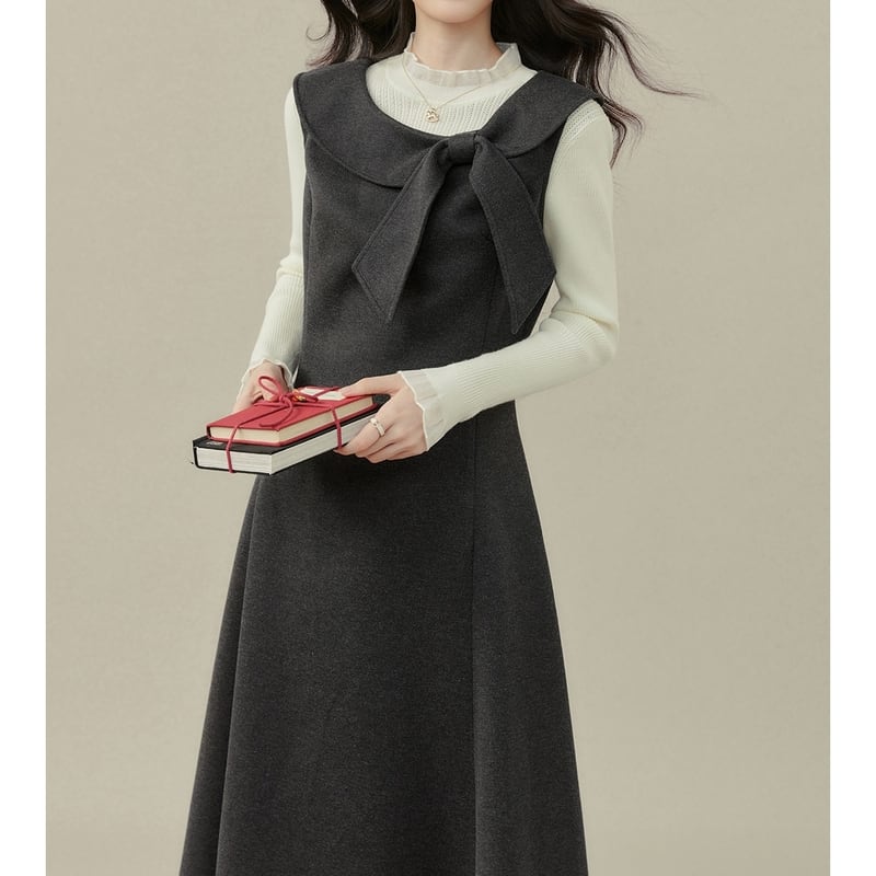 上品なリボン付き襟がアクセントになった、クラシカルな雰囲気のノースリーブワンピースです。