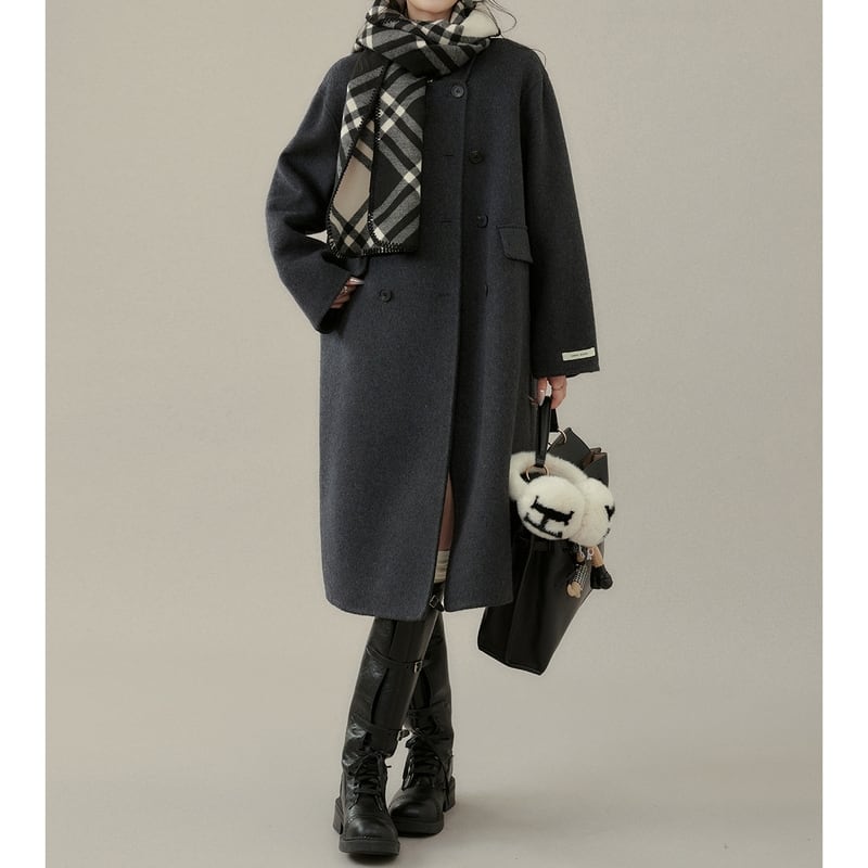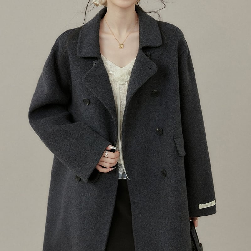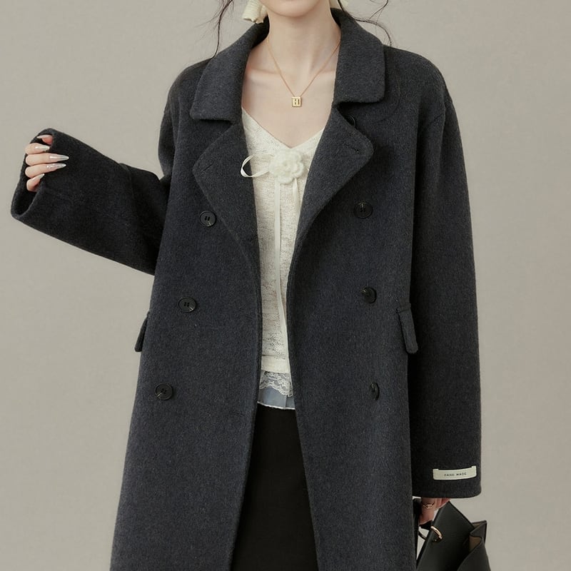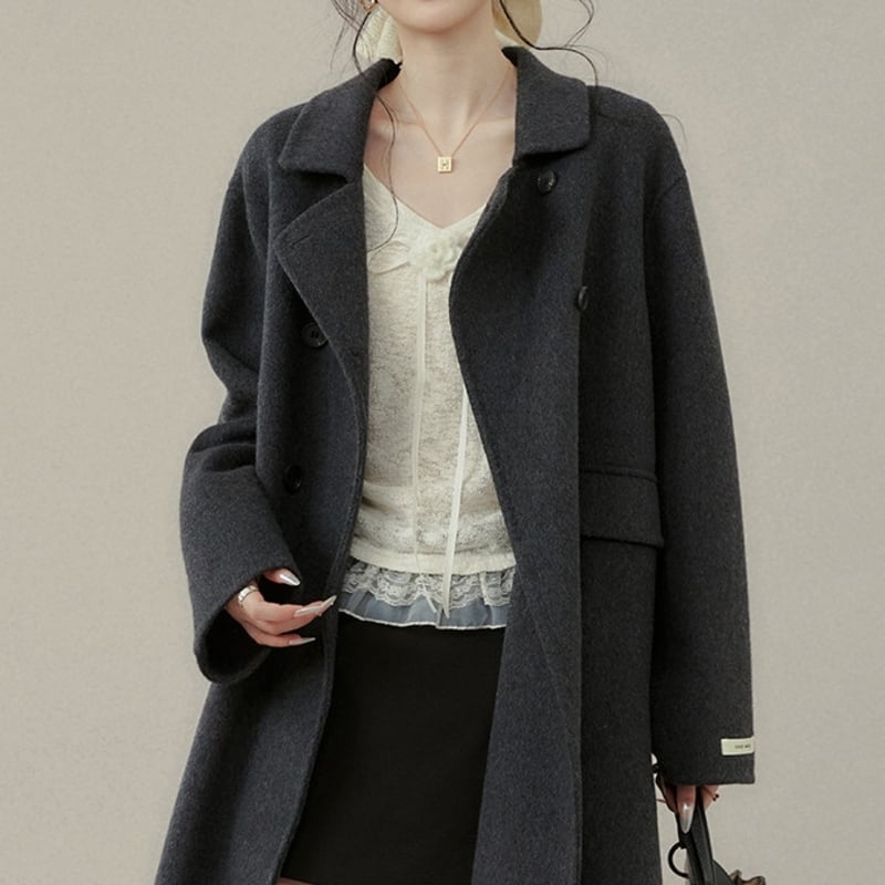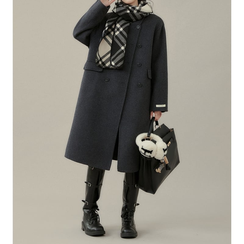 ダブルブレストがクラシカルな印象を与えるミモレ丈コートです。