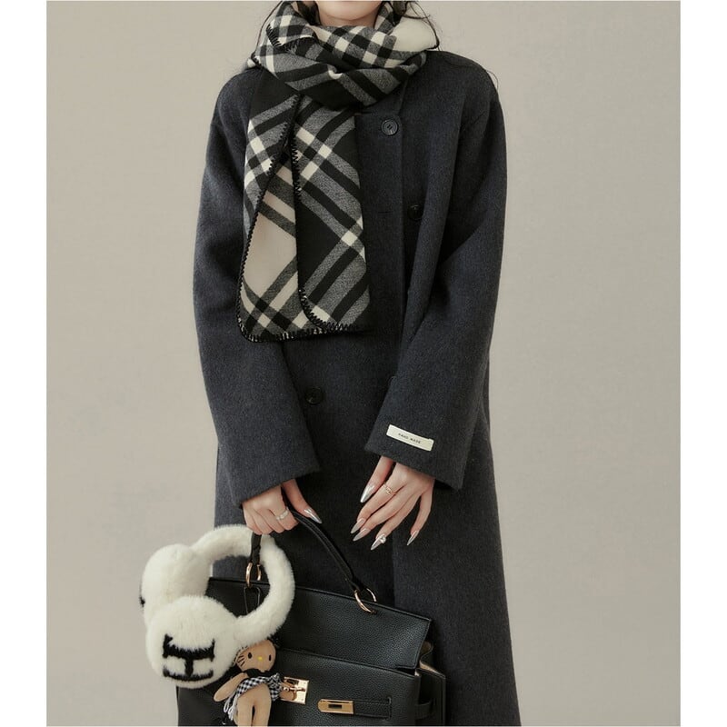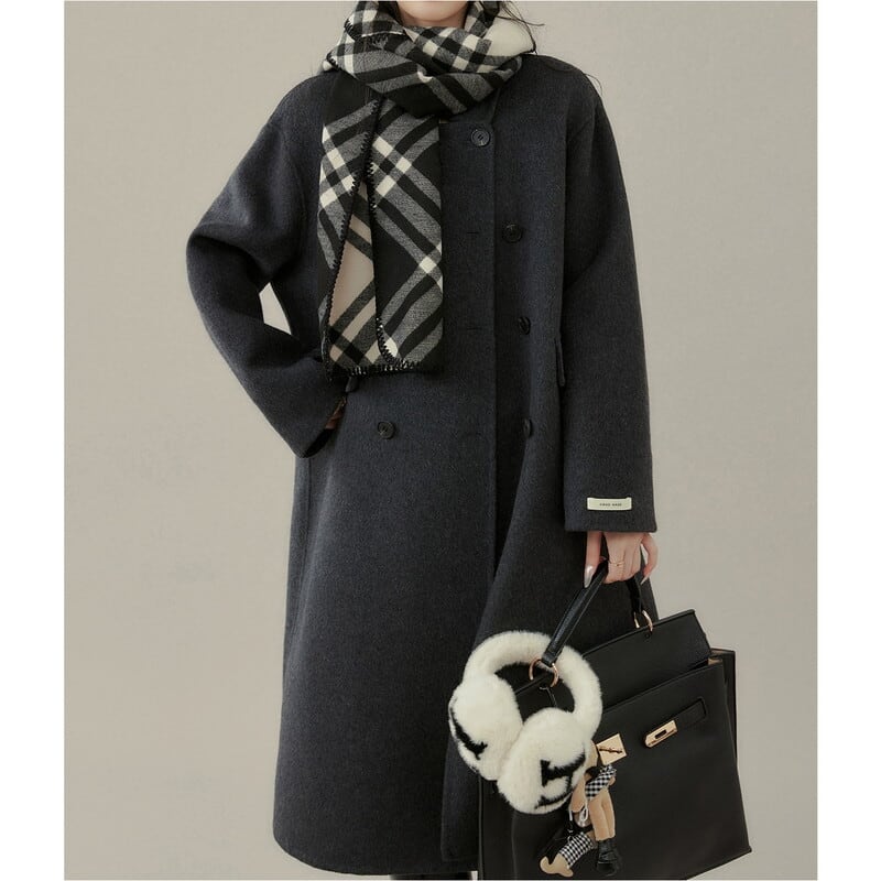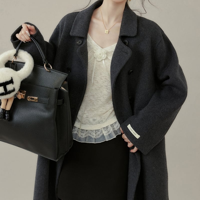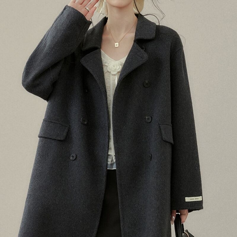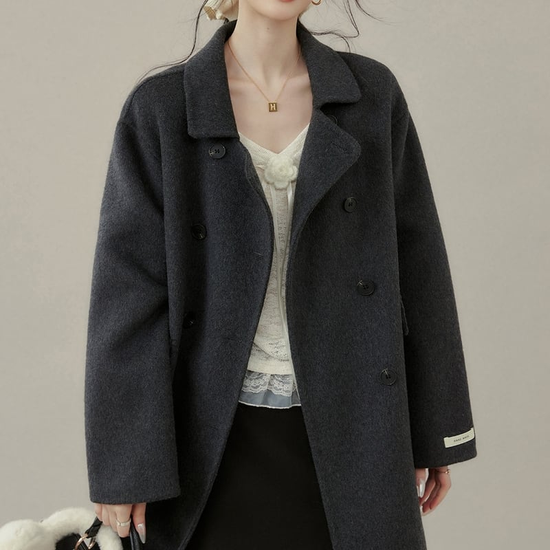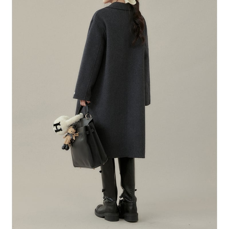 ダブルブレストがクラシカルな印象を与えるミモレ丈コートです。