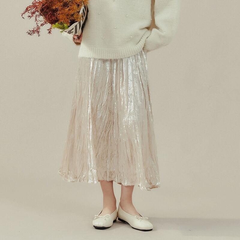 艶やかな光沢を放つ、エレガントなミモレ丈スカートです。