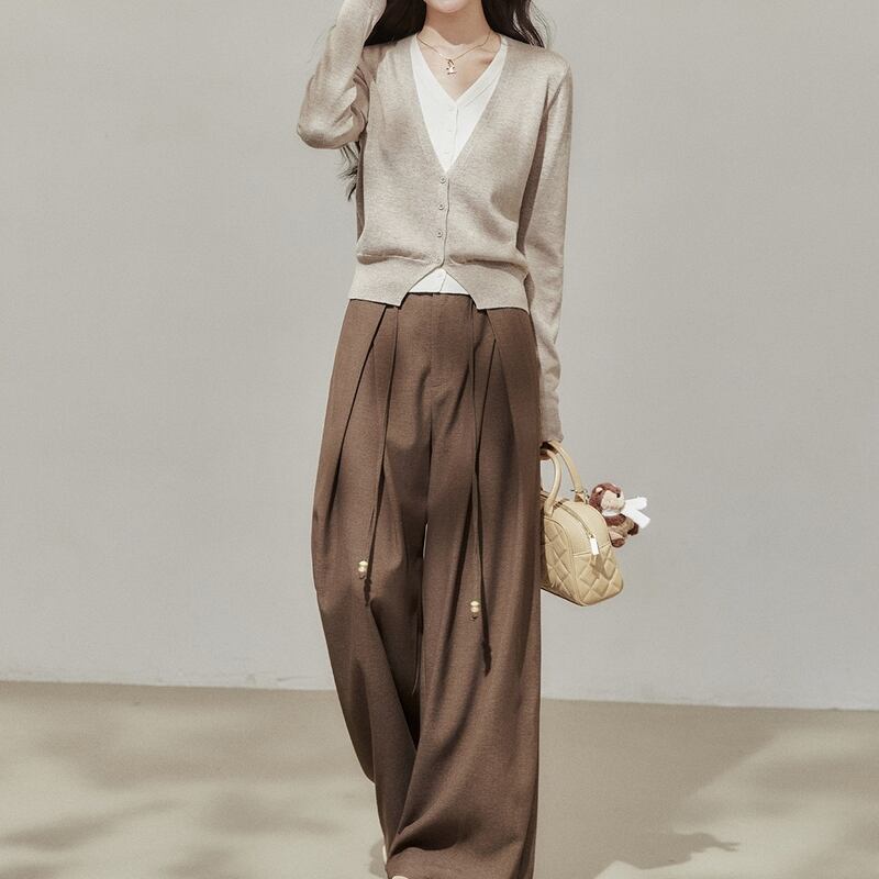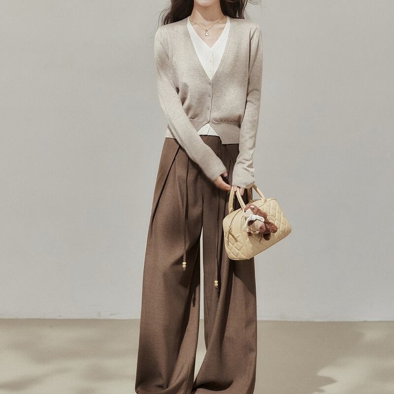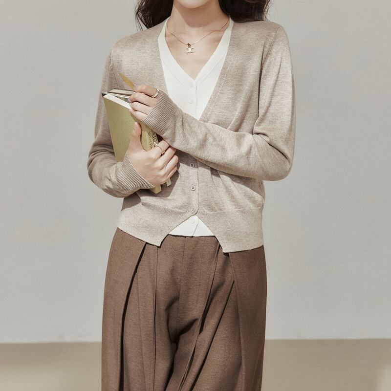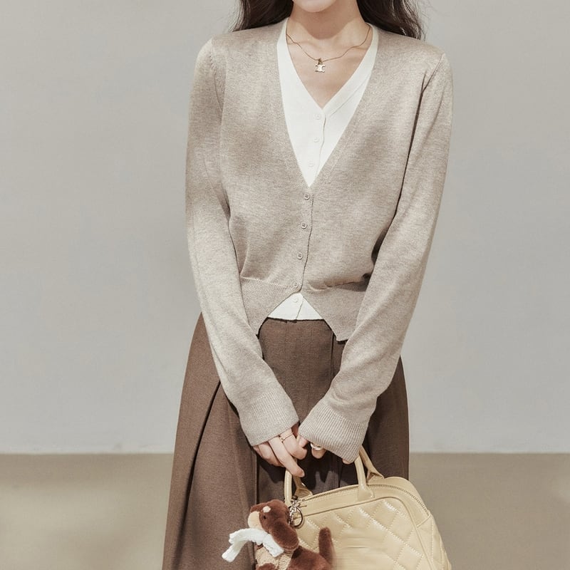顔周りをすっきりと見せるバイカラーのレイヤード風Vネックのカーディガンです。