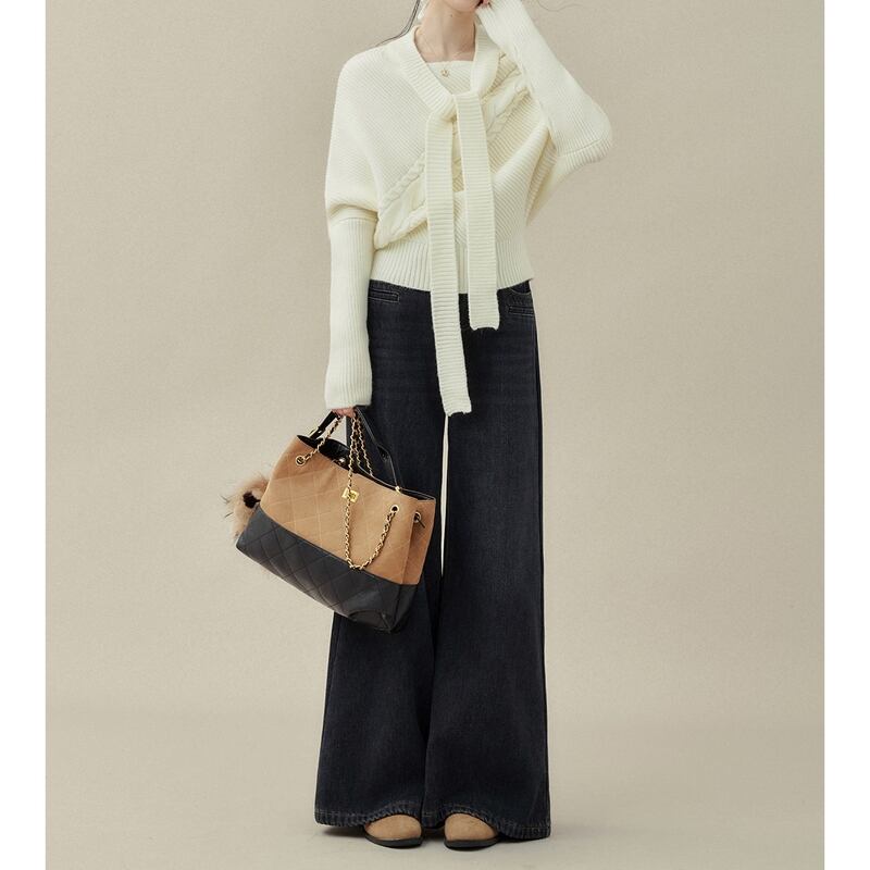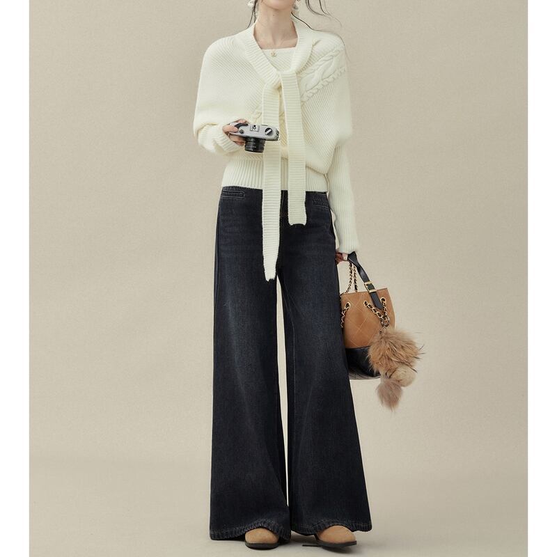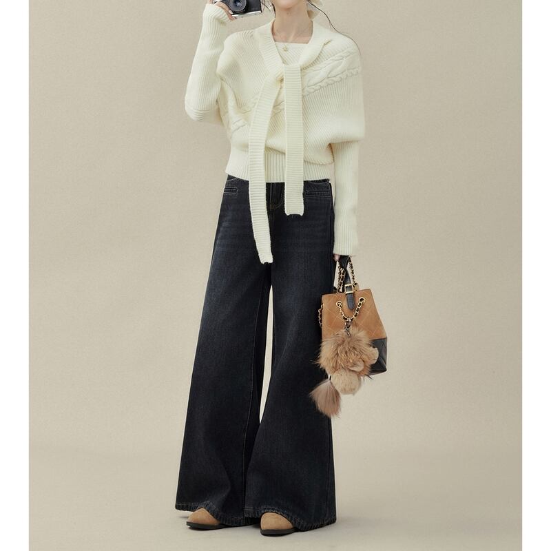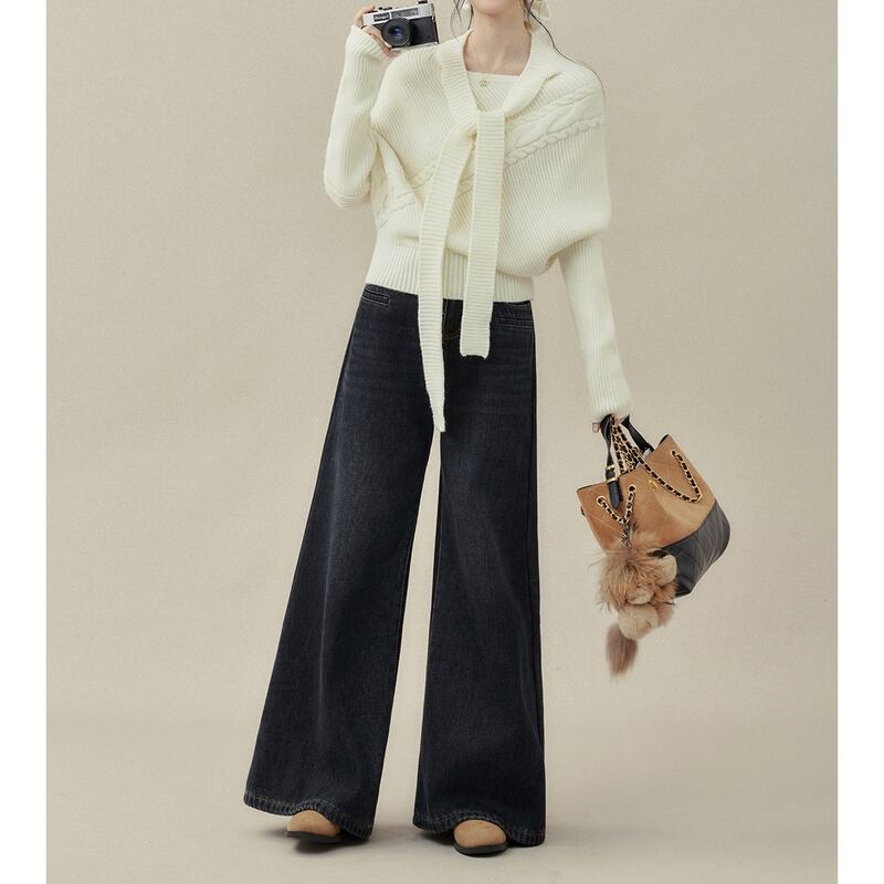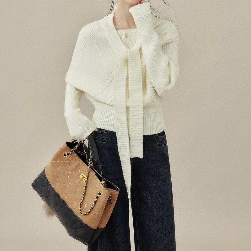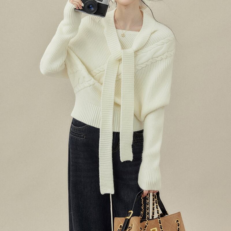 リボンタイがアクセントになるケーブルニットトップスです。