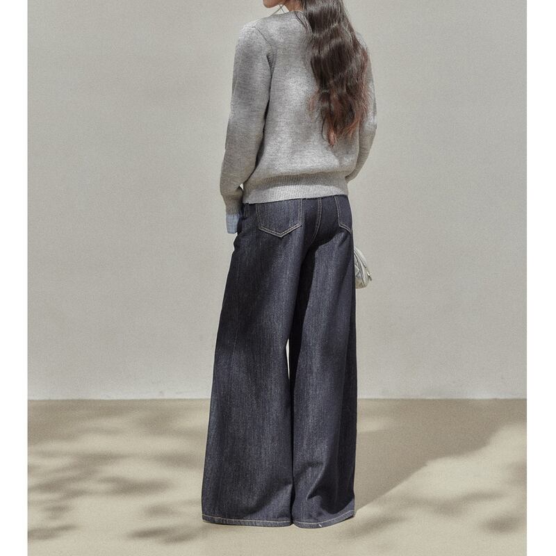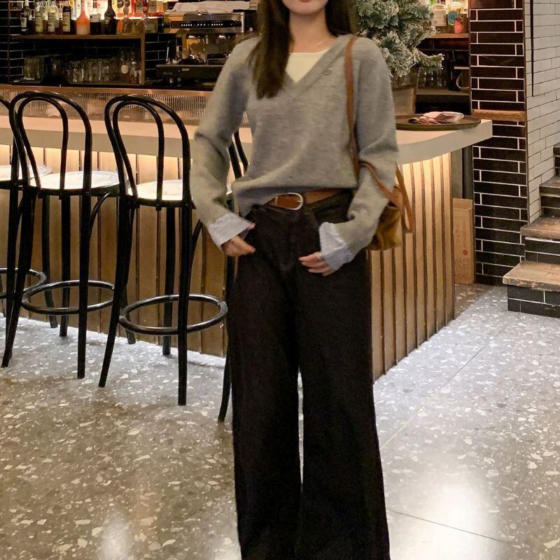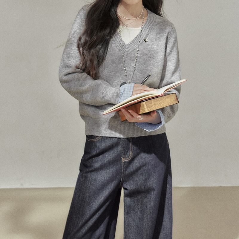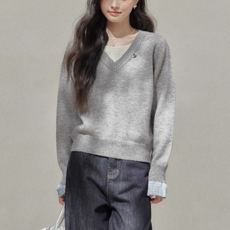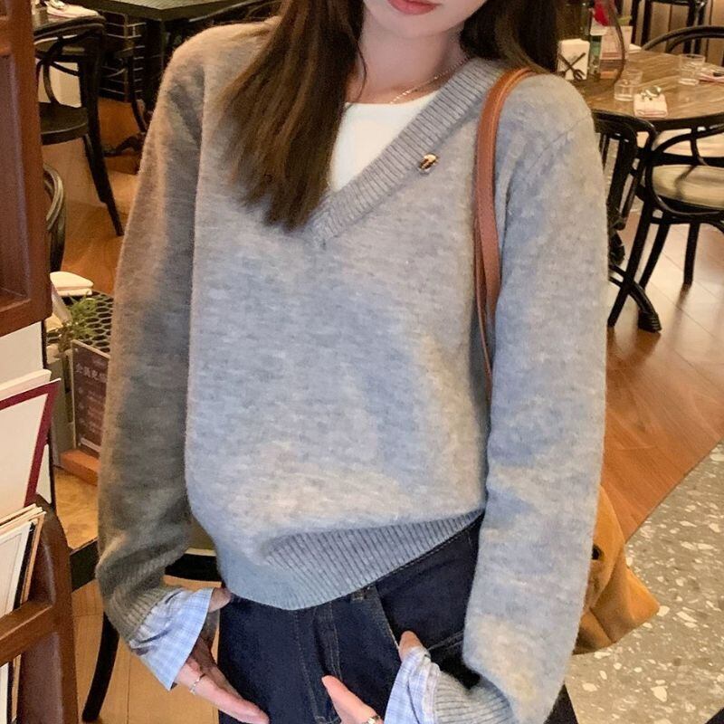 深めのVネックが顔周りをすっきりと見せてくれるニットトップスです。