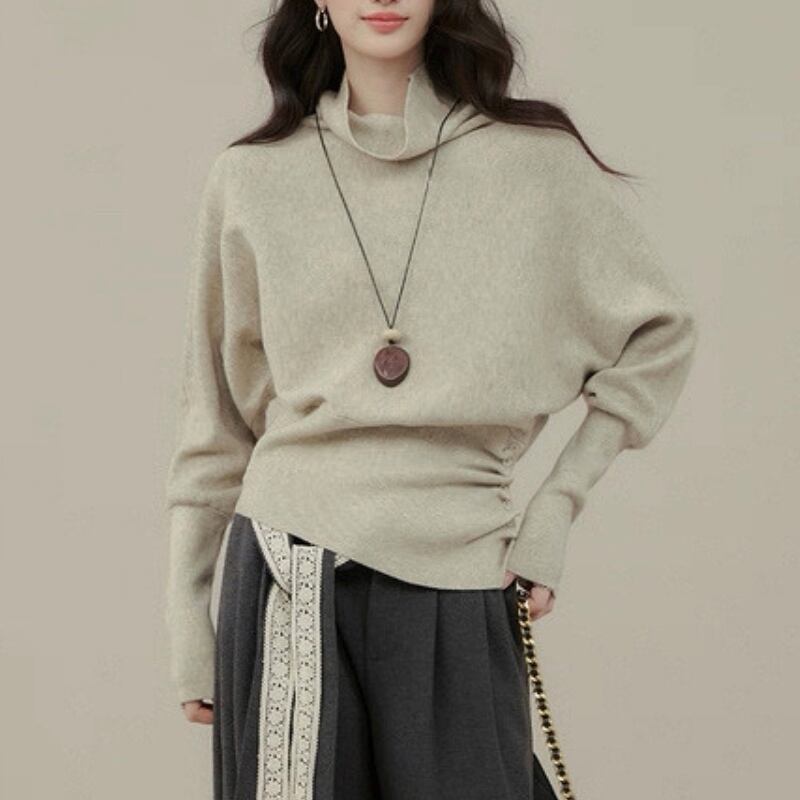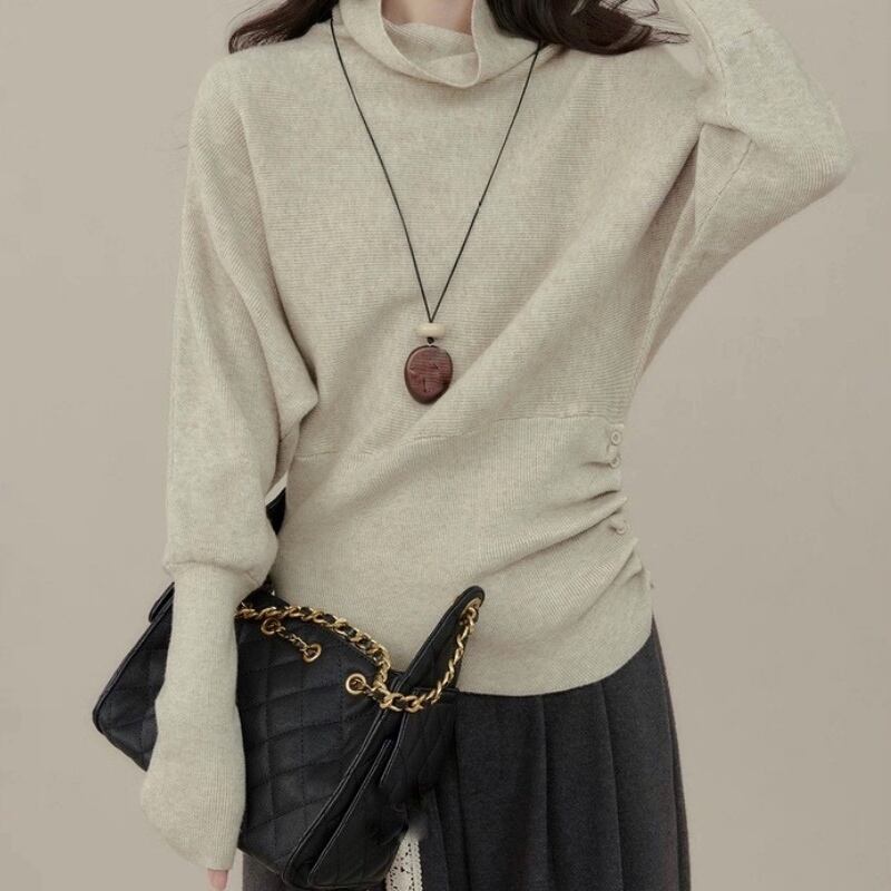 首元を優しく包むタートルネックが、上品な印象を与えるニットトップスです。