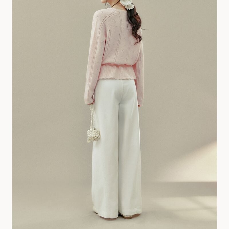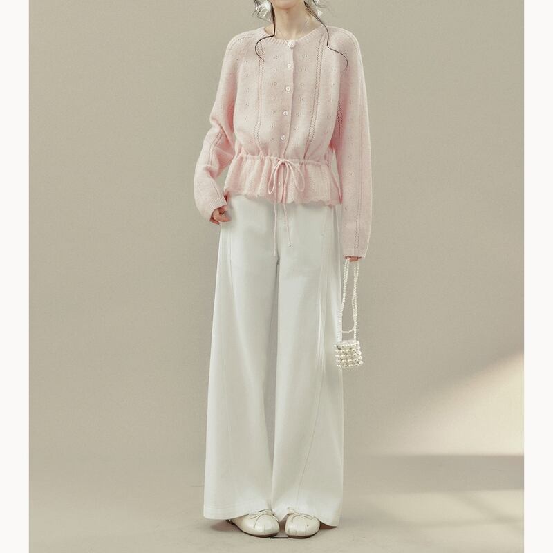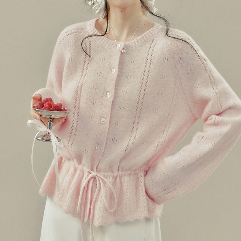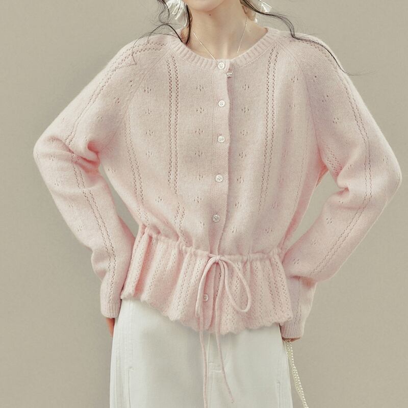 フロントボタンデザインと透かし編みの軽やかさが上品な印象のカーディガンです。