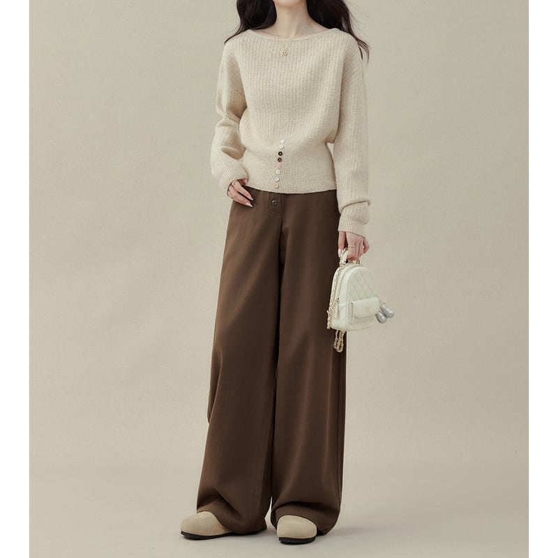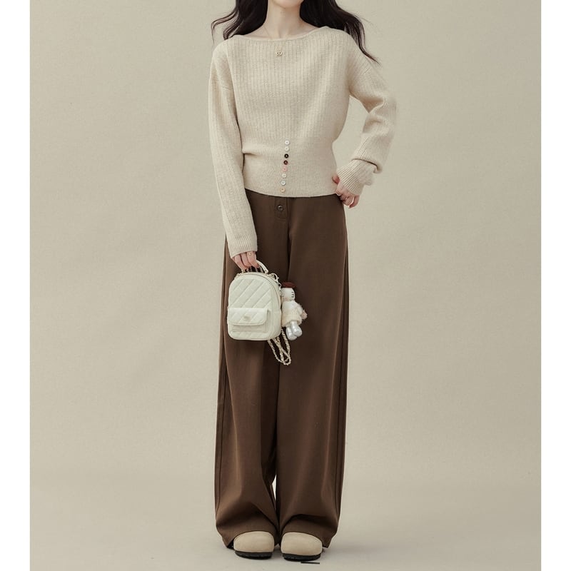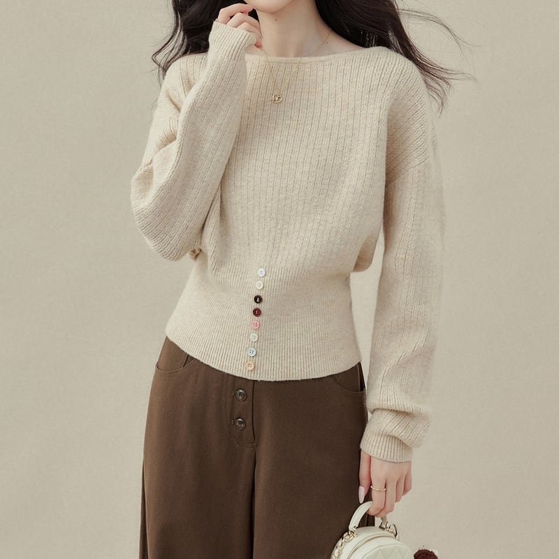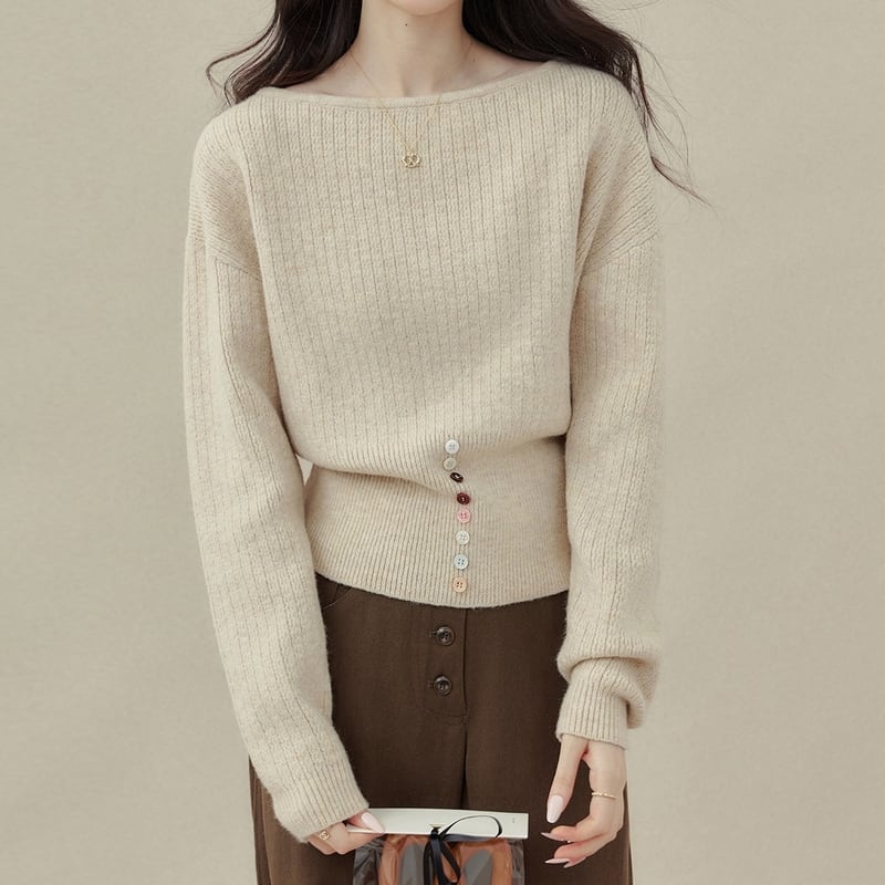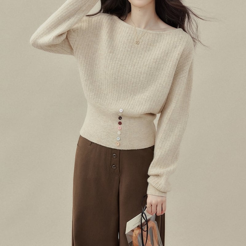 程よい開き具合のネックラインが、デコルテをきれいに見せてくれるニットトップスです。