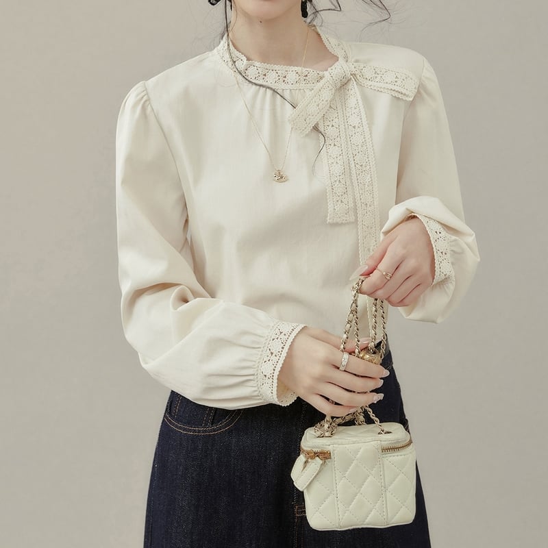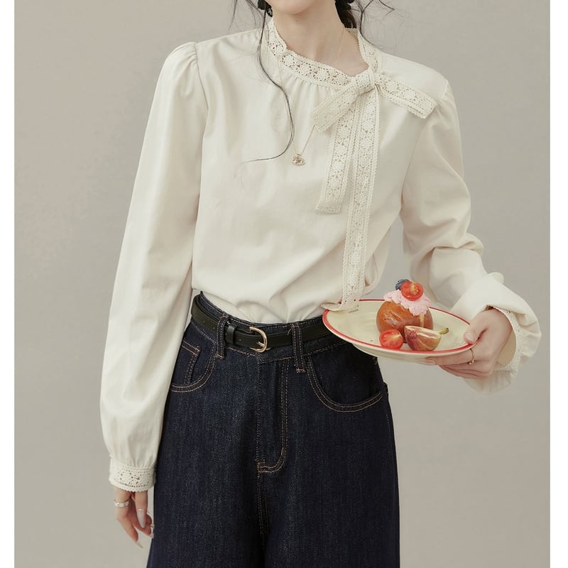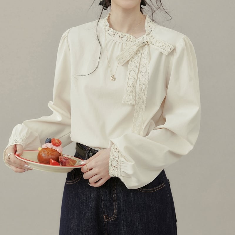 首元のレースとリボンがフェミニンな印象を与える長袖ブラウスです。