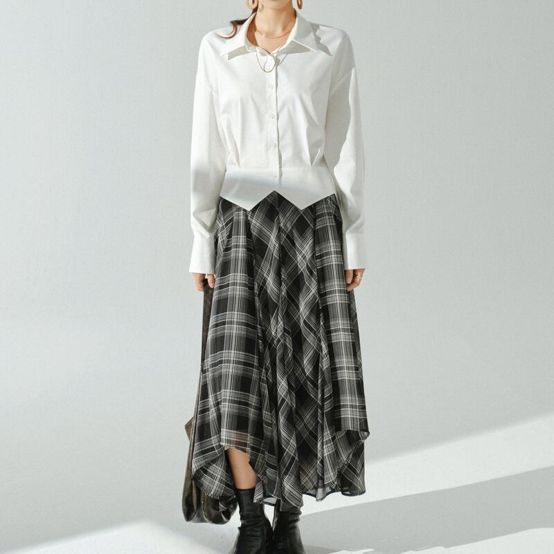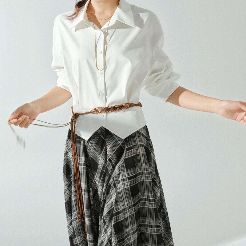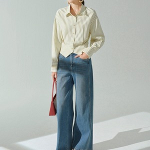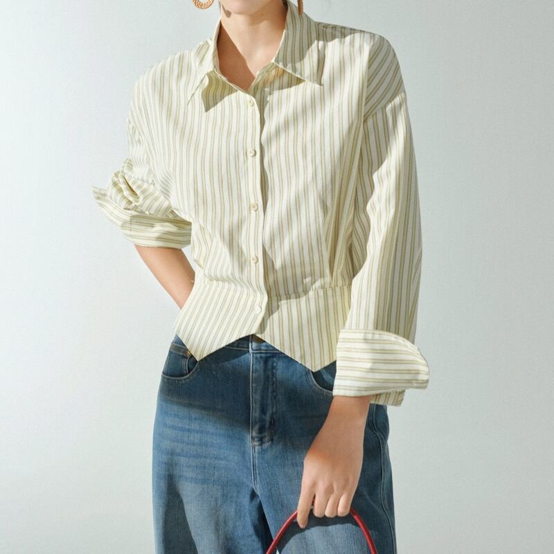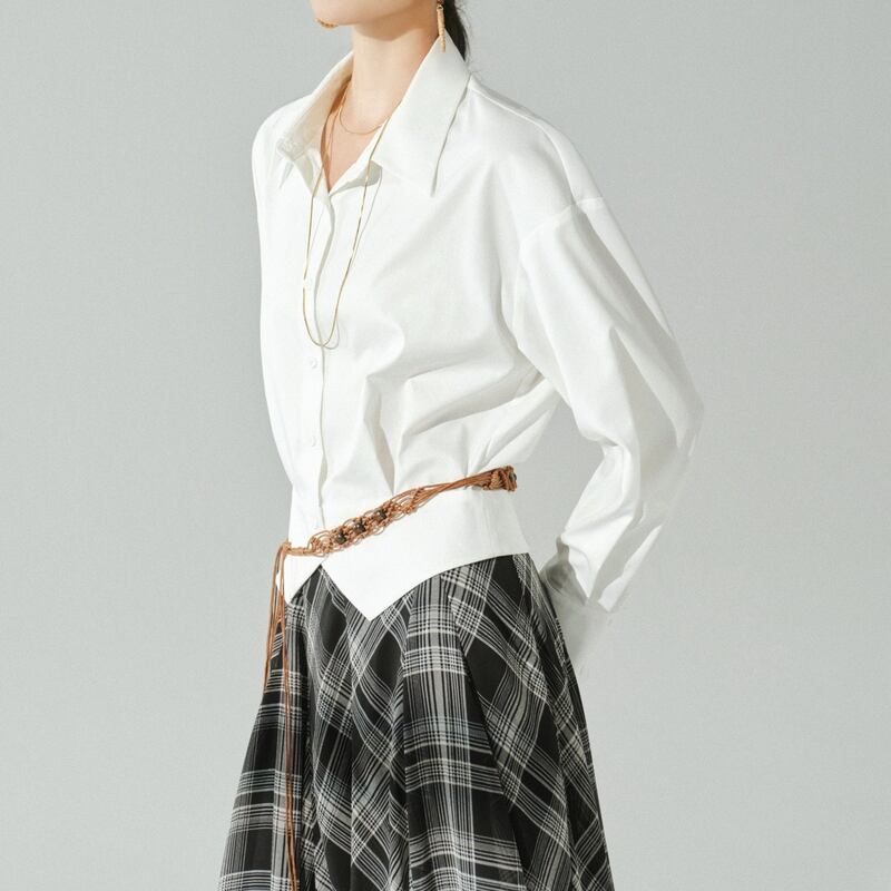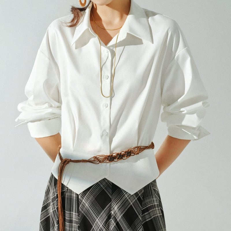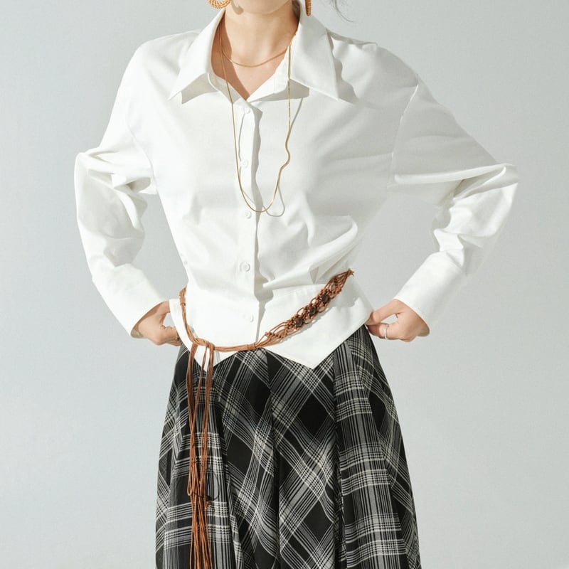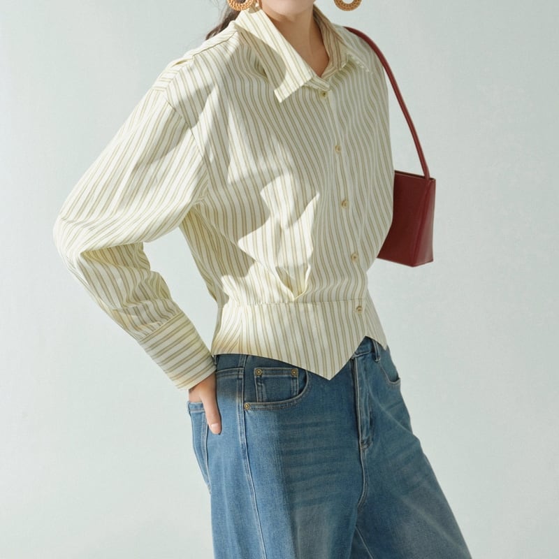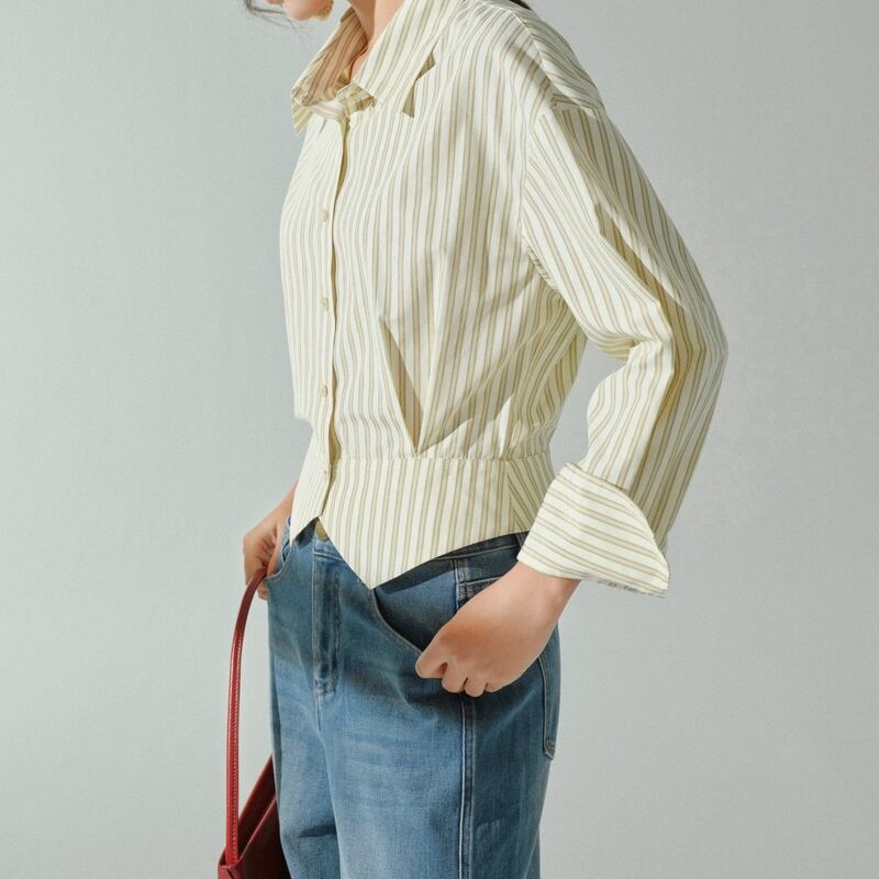 すっきりとした印象のウエストのカットが個性的なショート丈シャツです。