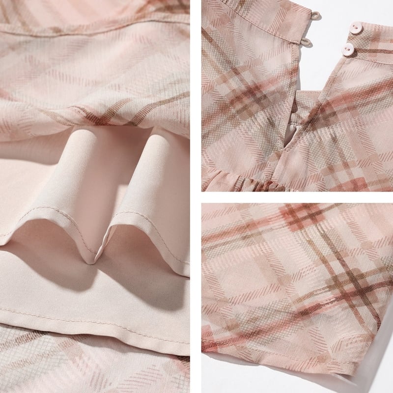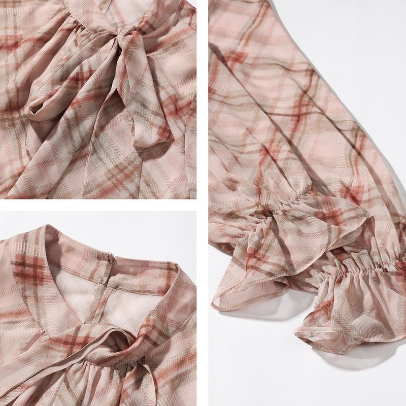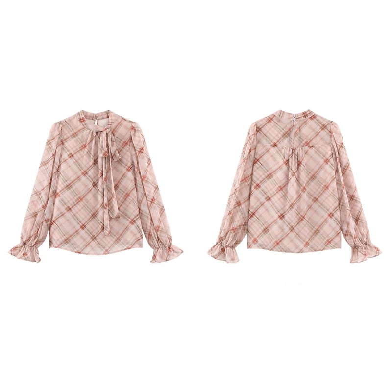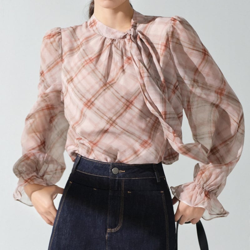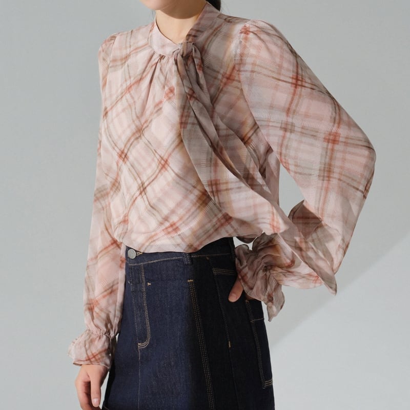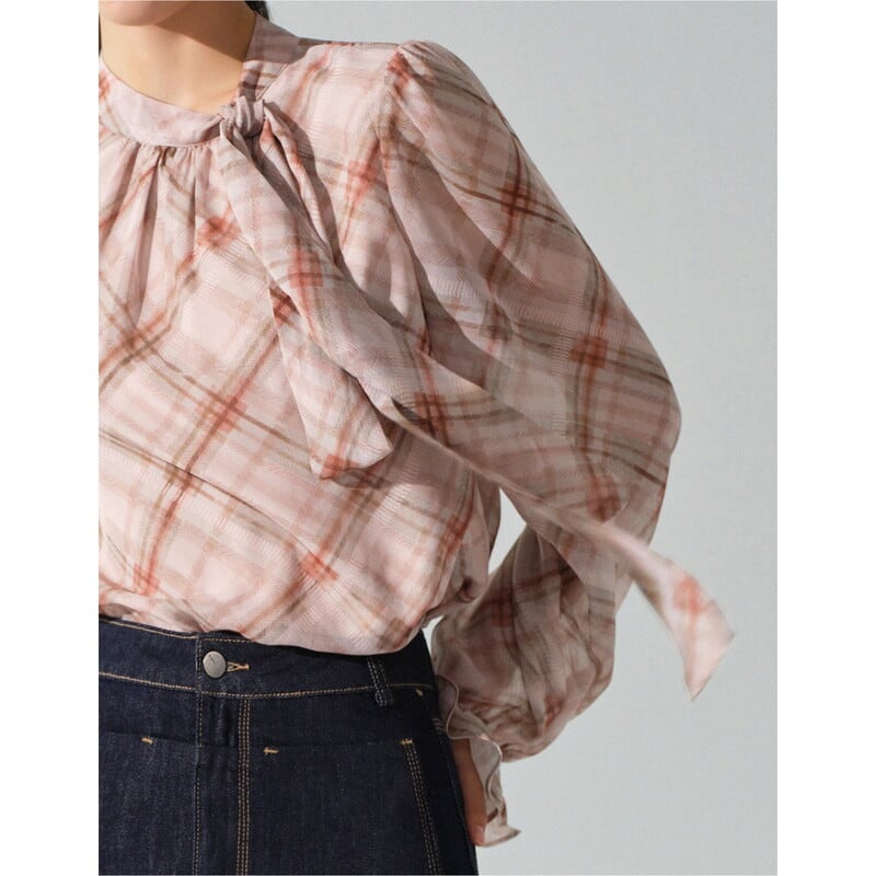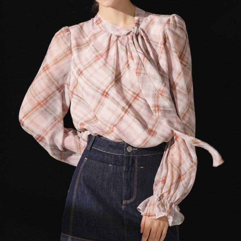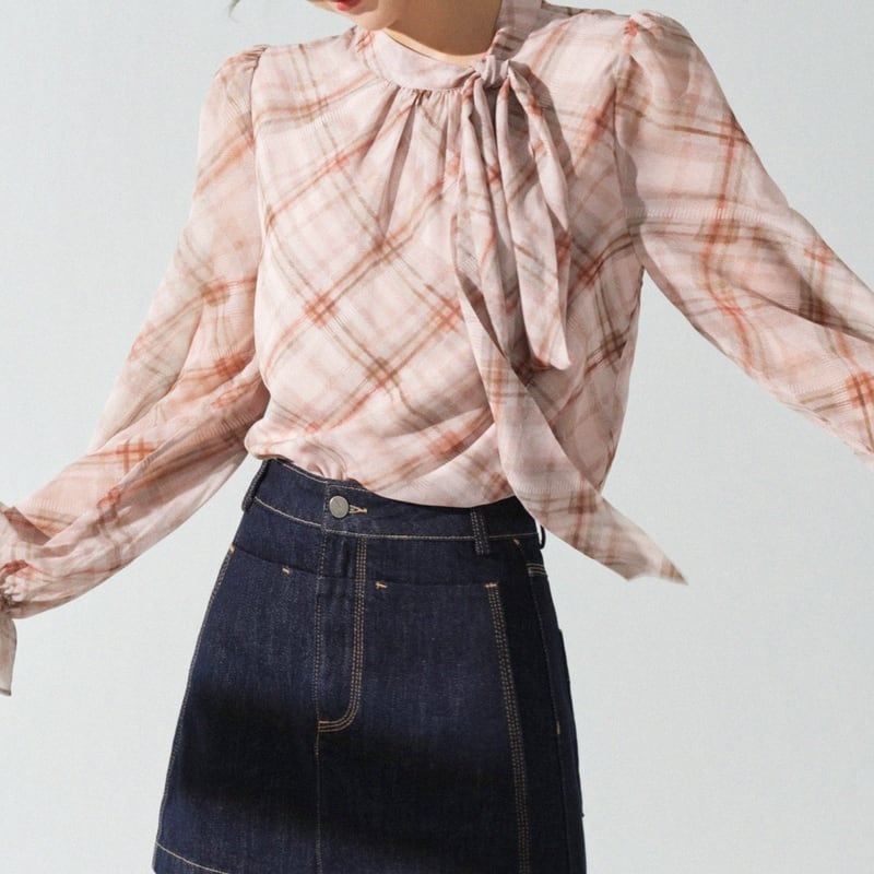 リボンタイがアクセントになる、フェミニンなチェック柄ブラウスです。