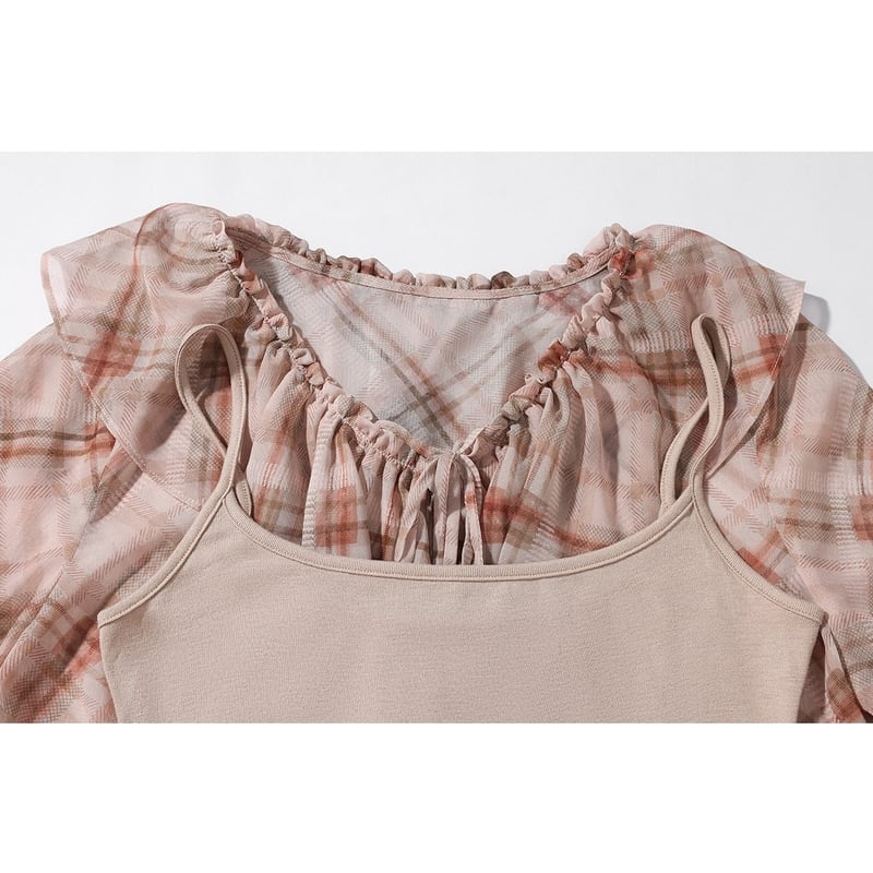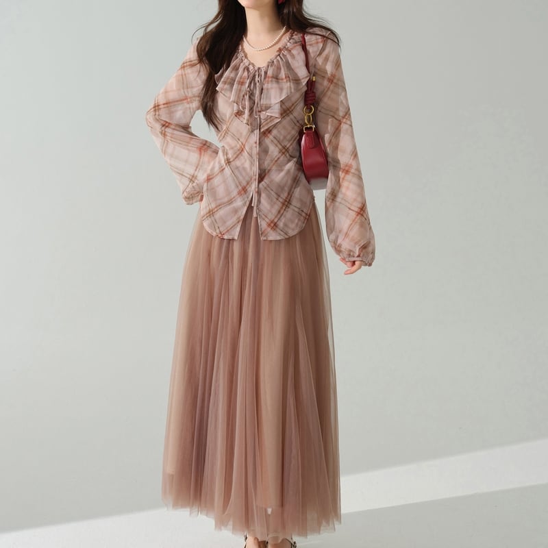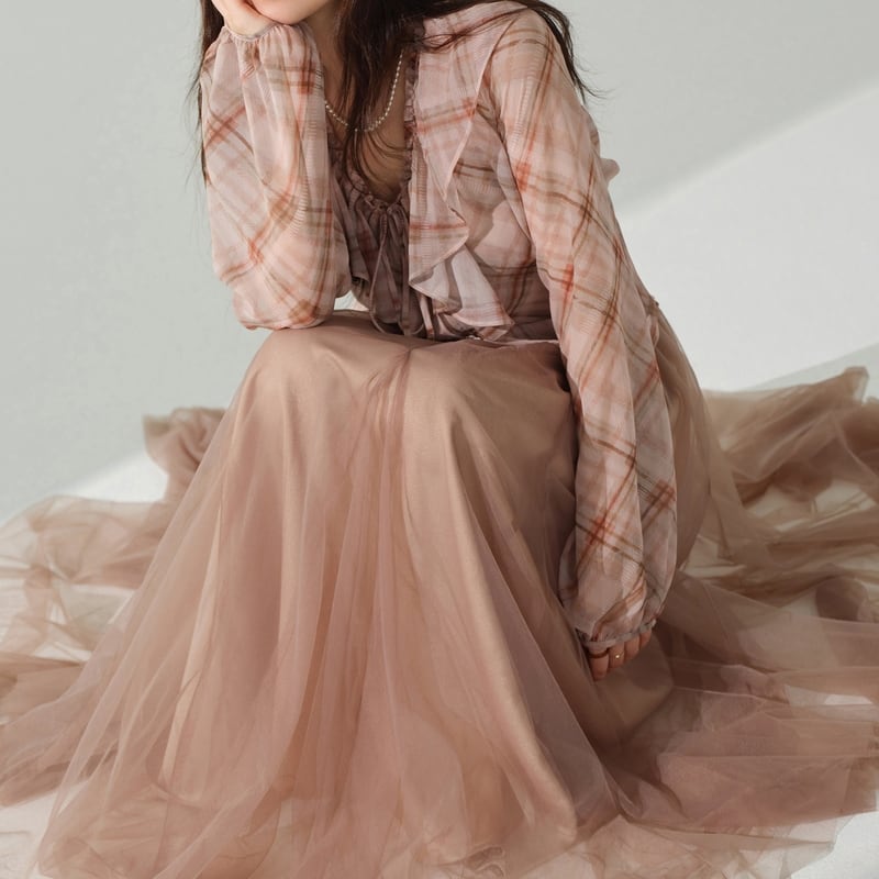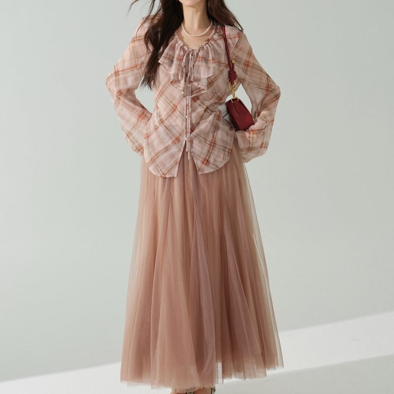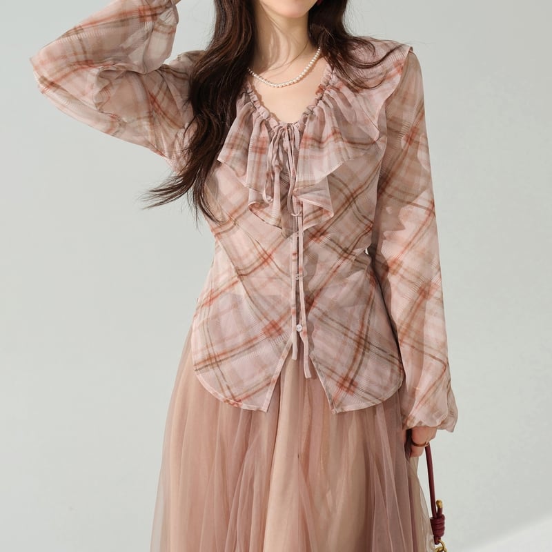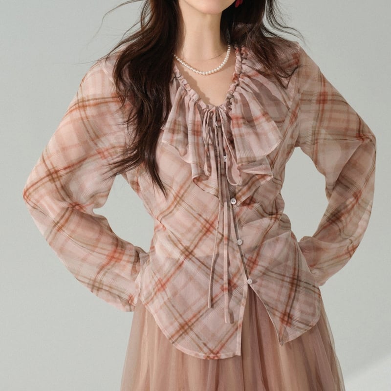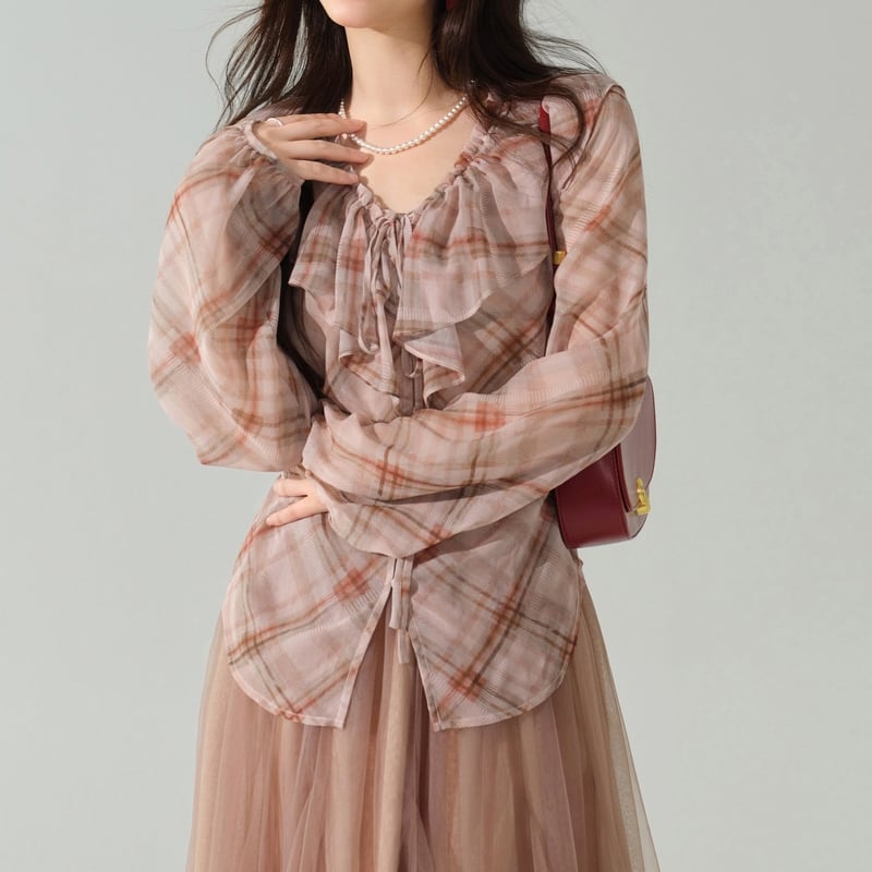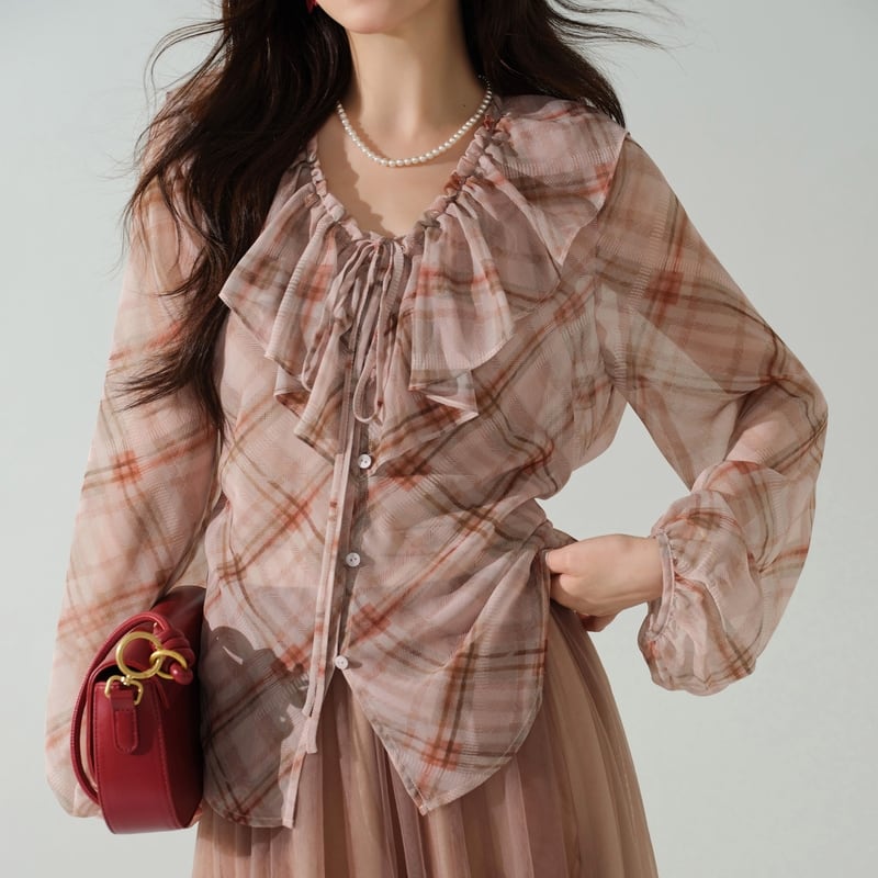 淡いチェック柄がカジュアルながらも、女性らしい印象を与えます。