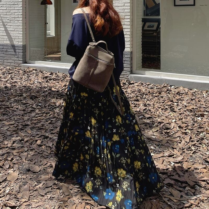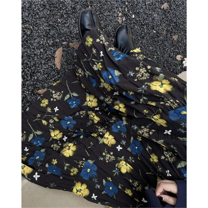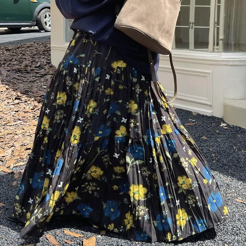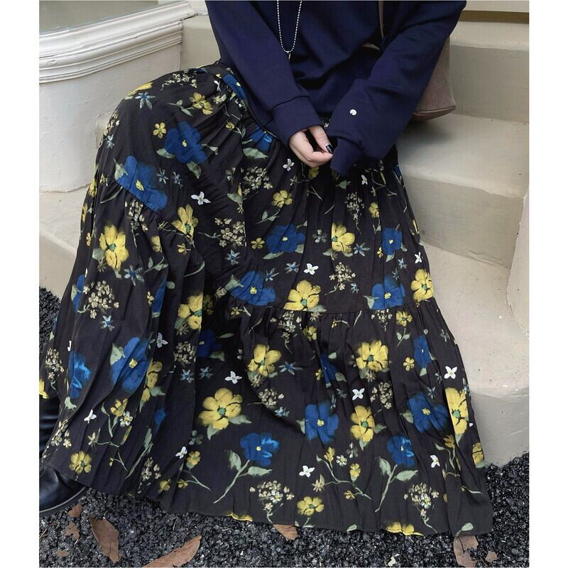 華やかな花柄が目を惹くマキシ丈ロングティアードスカートです。