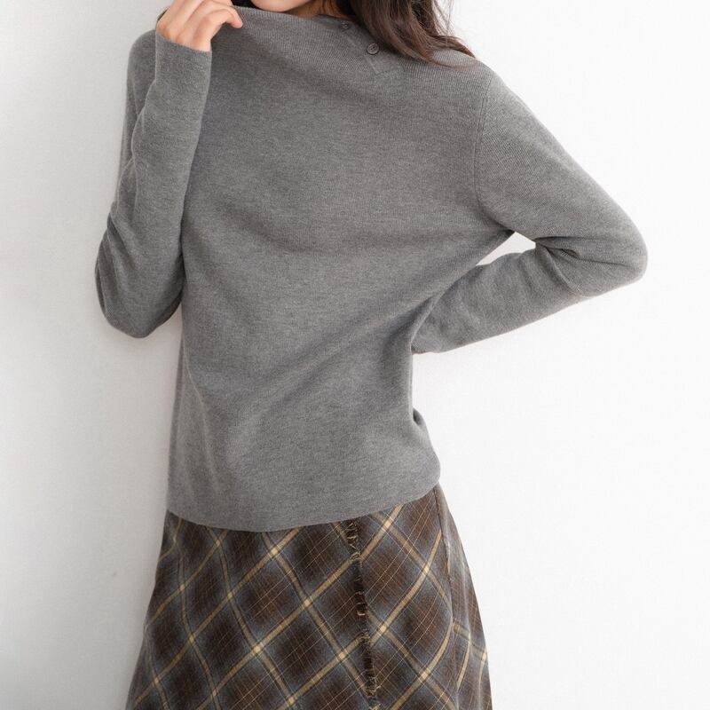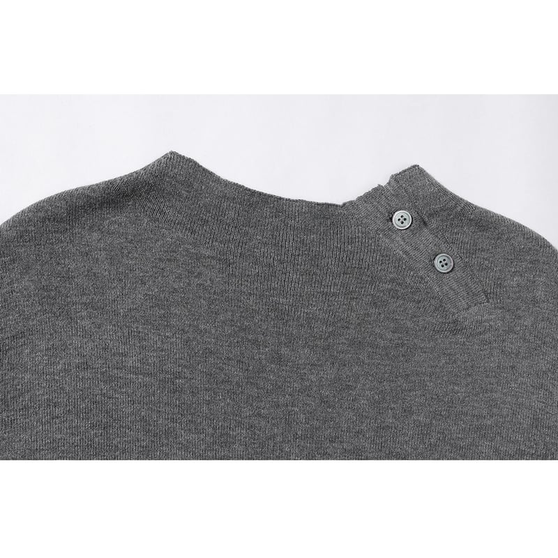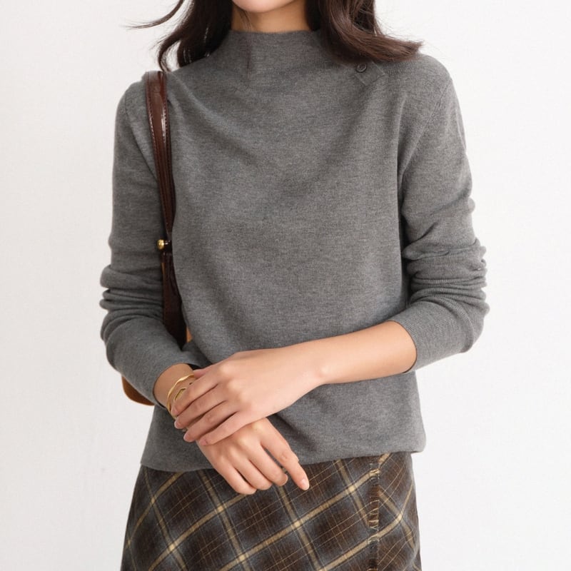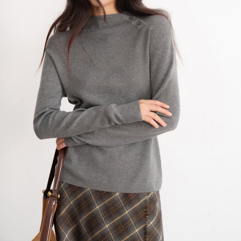 アシンメトリーネックが目を引く、ボタンがアクセントの大人のこなれ感ニット。