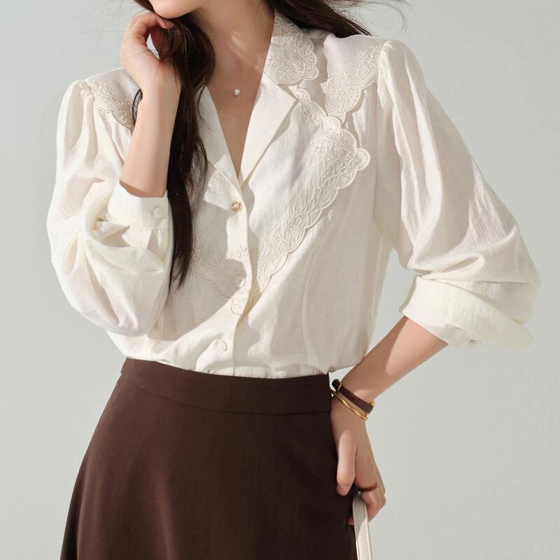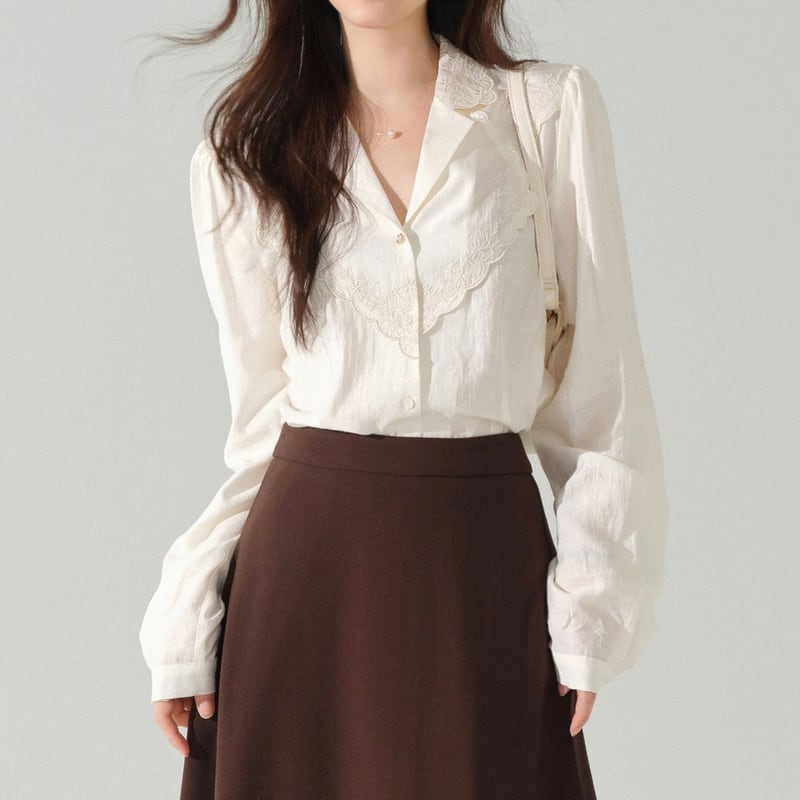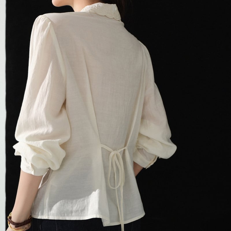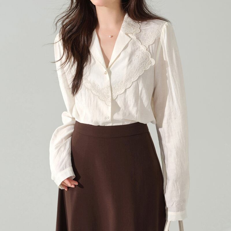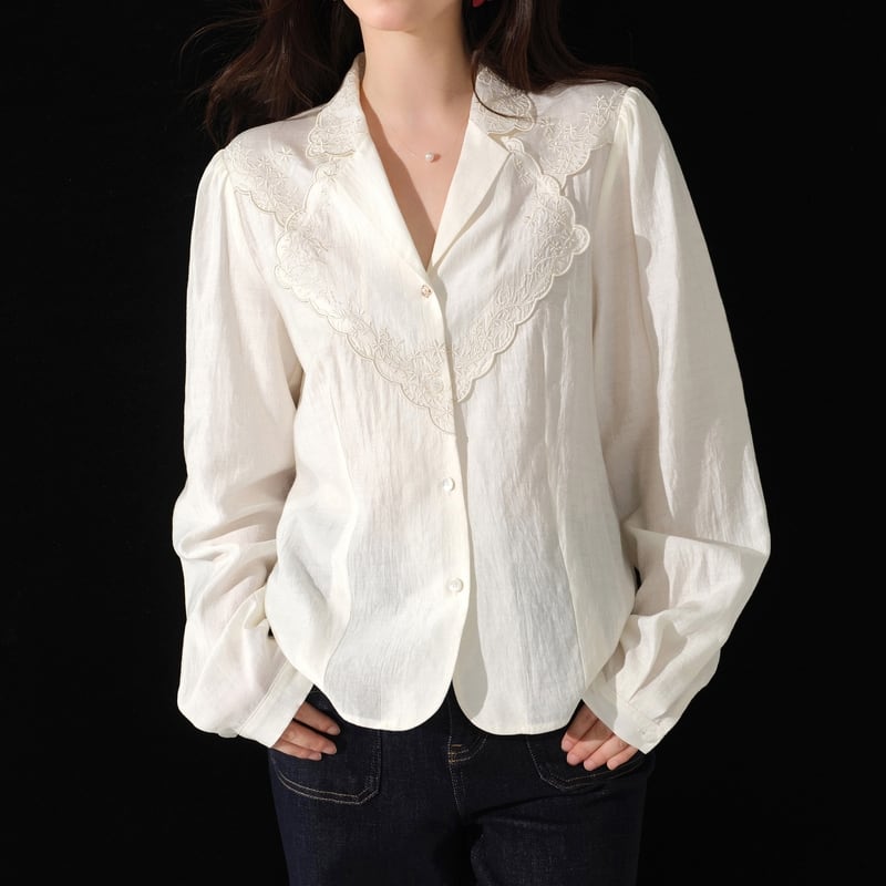 おおぶりな襟のレースがアクセントになり、顔周りを華やかに演出するブラウスです。