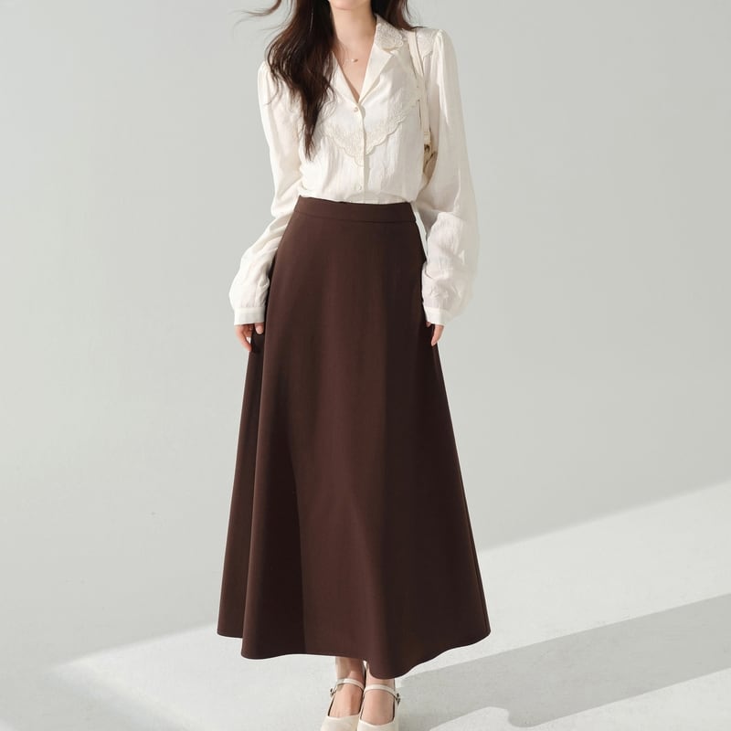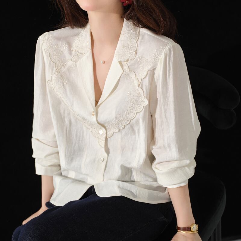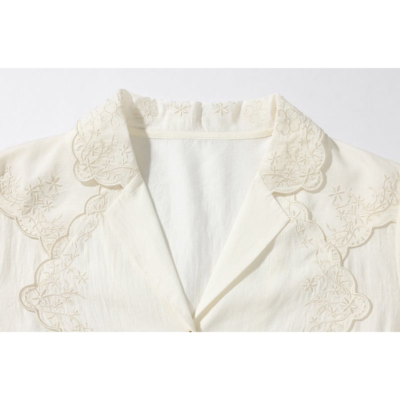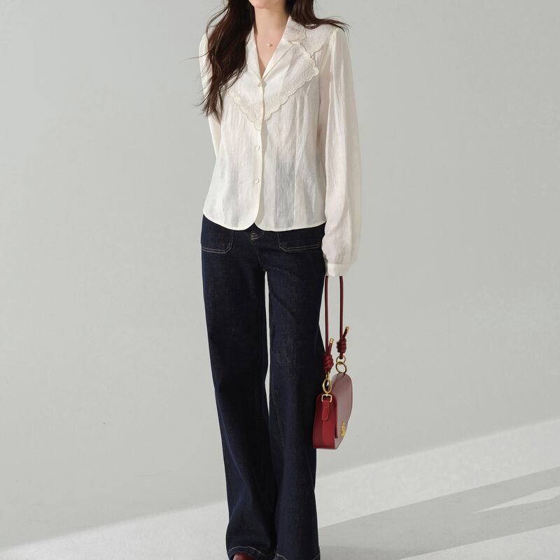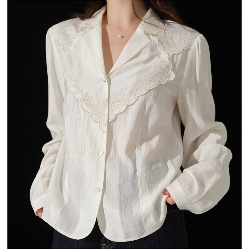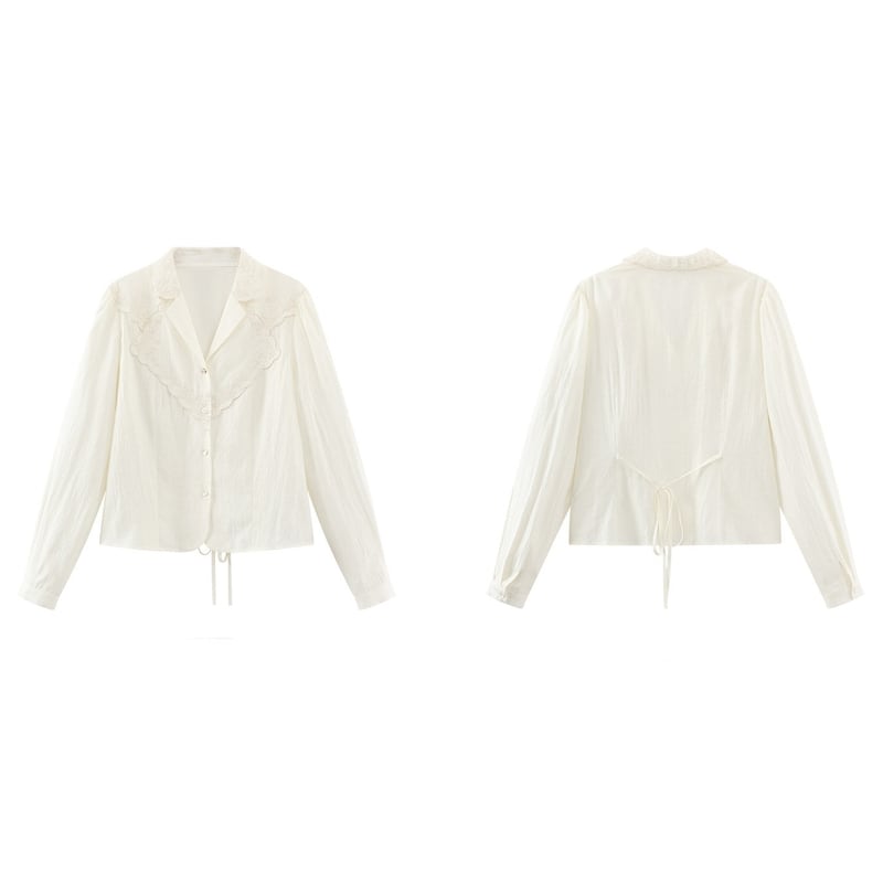 おおぶりな襟のレースがアクセントになり、顔周りを華やかに演出するブラウスです。