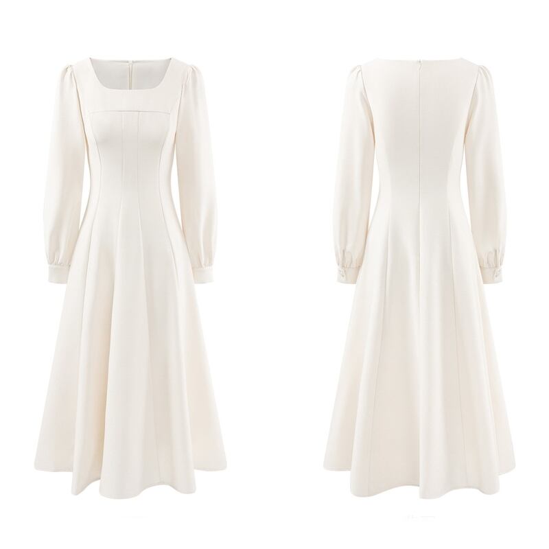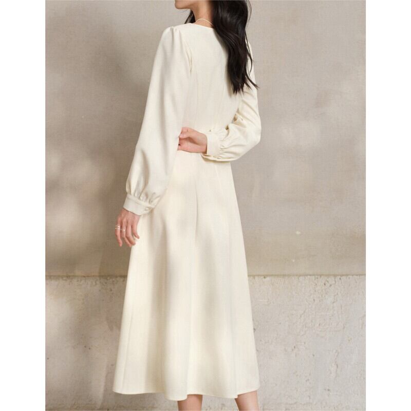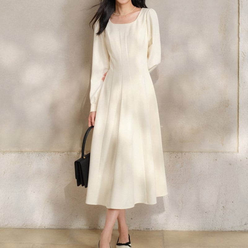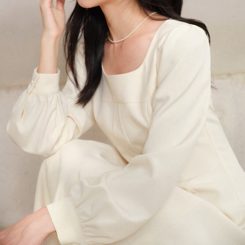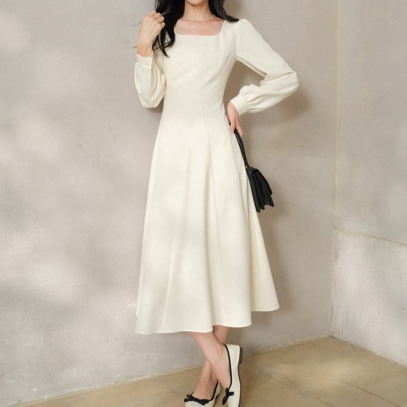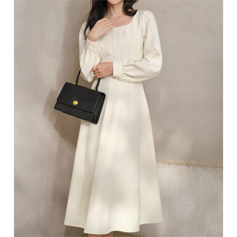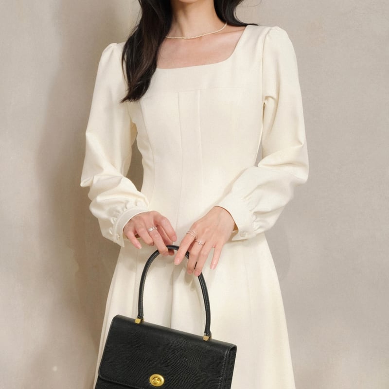 上品なスクエアネックが顔周りをすっきりと見せてくれるワンピースです。
