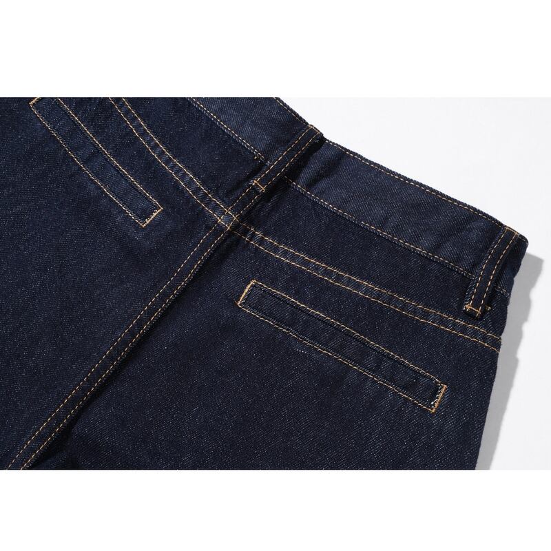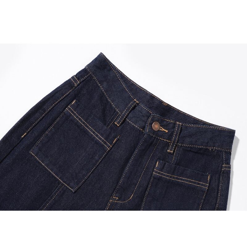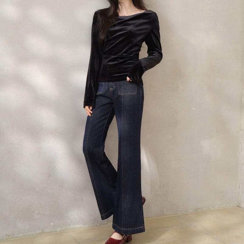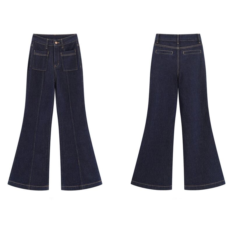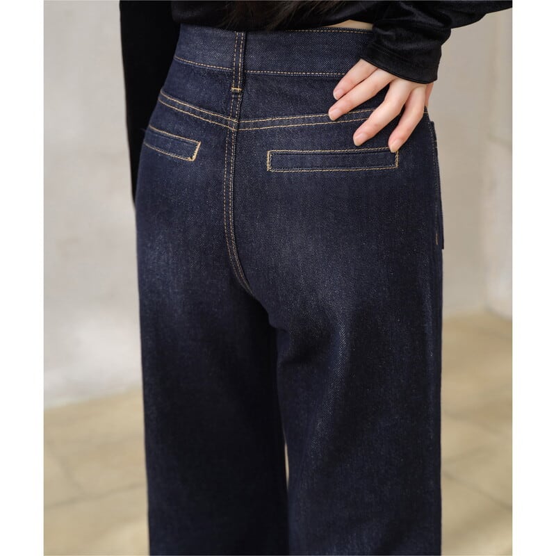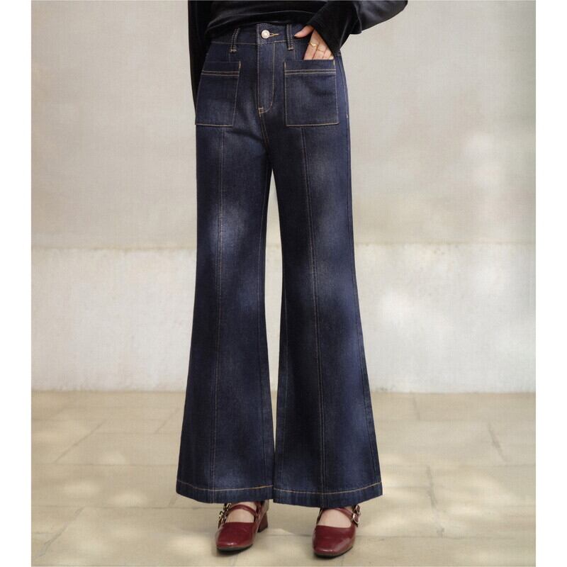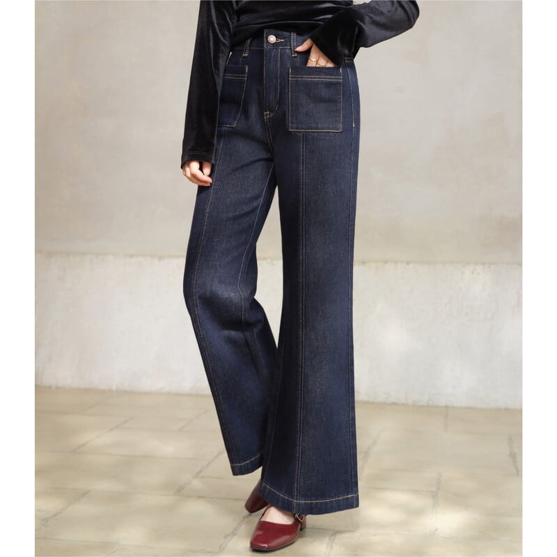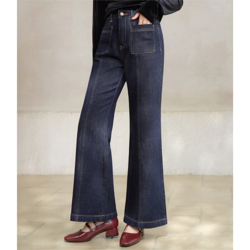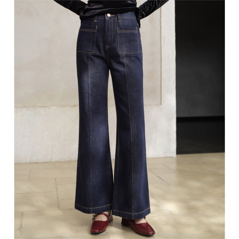 ステッチがアクセントになった、フルレングス丈のワイドフレアデニムパンツです。