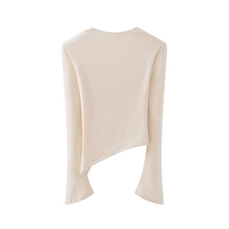 アシンメトリーな裾が目を引く、長袖のクロップド丈ニットソーです。