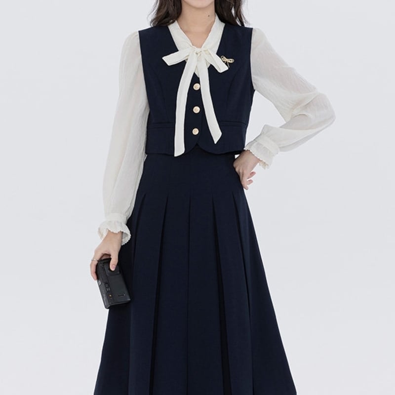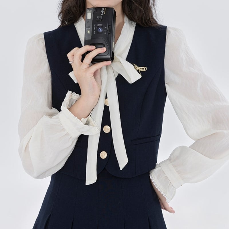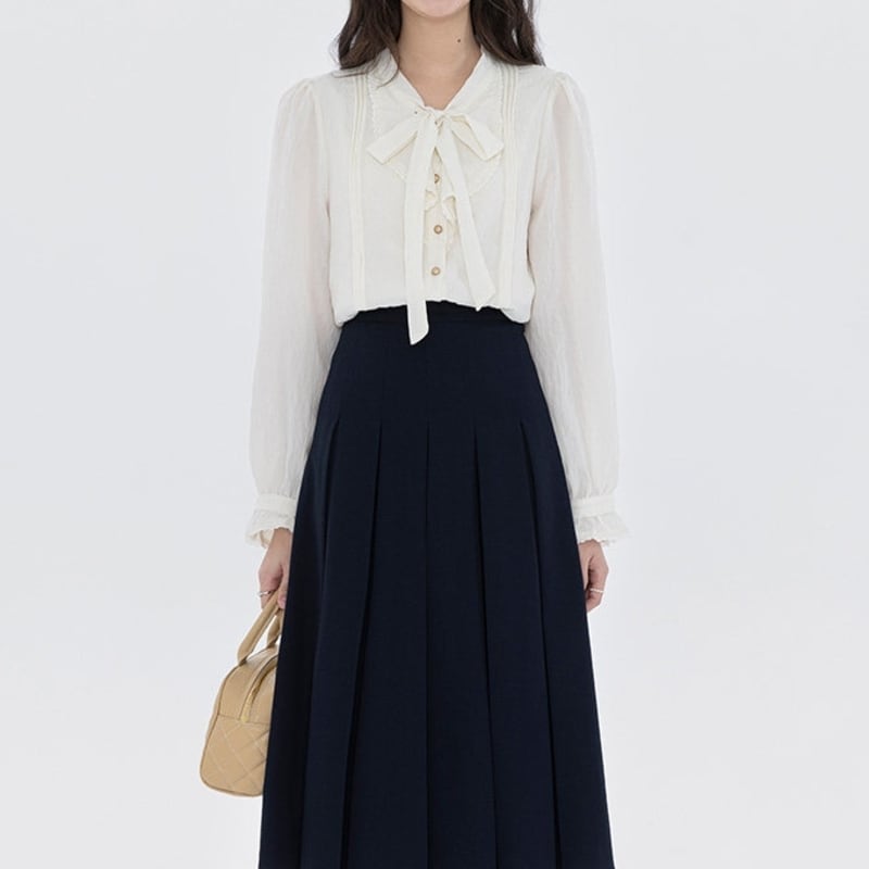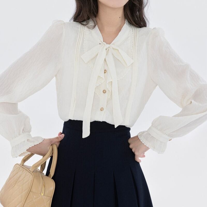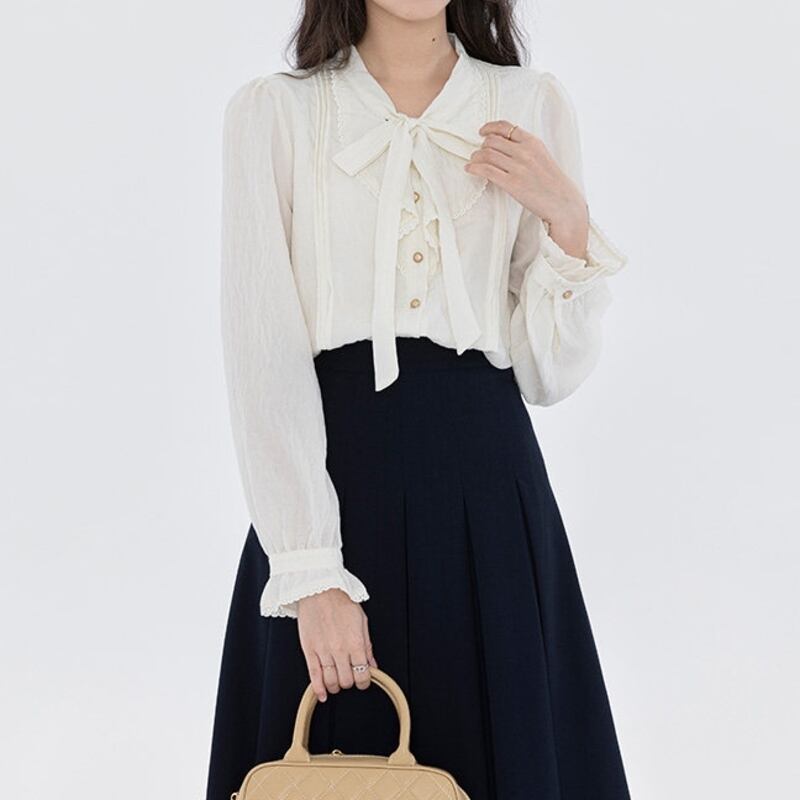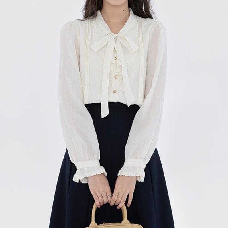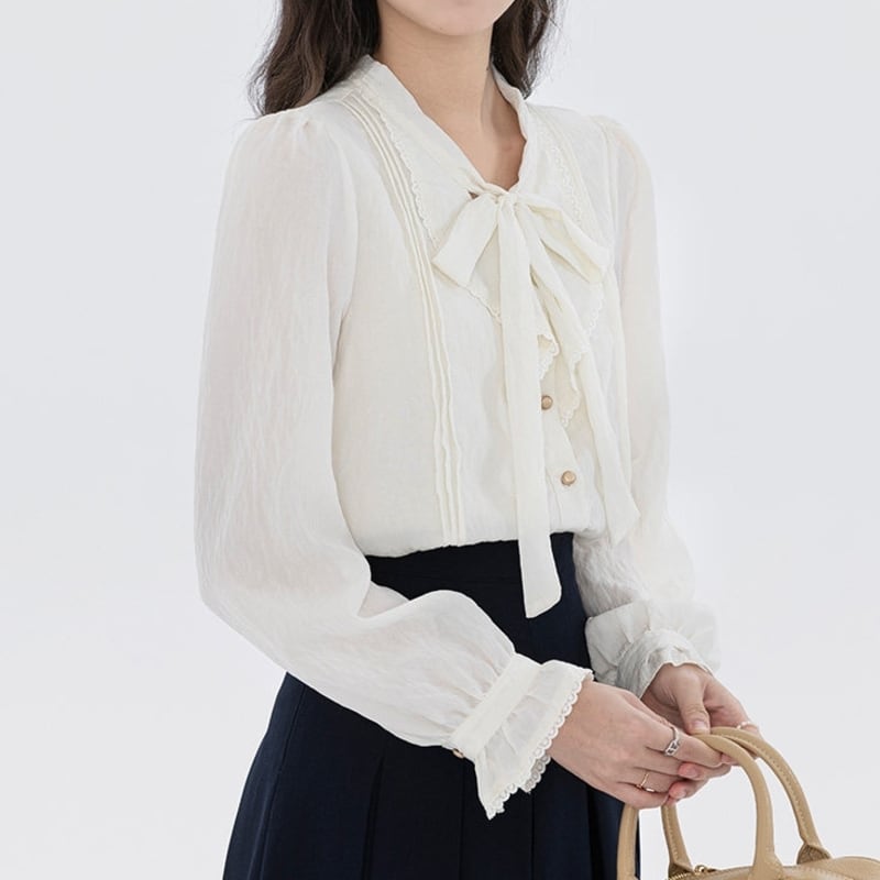 リボンタイがアクセントになった、上品な印象の繊細なピンタックフリルブラウスです。