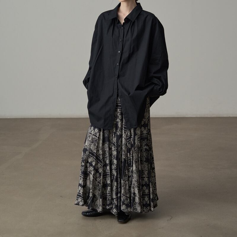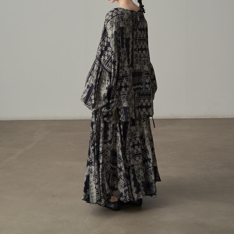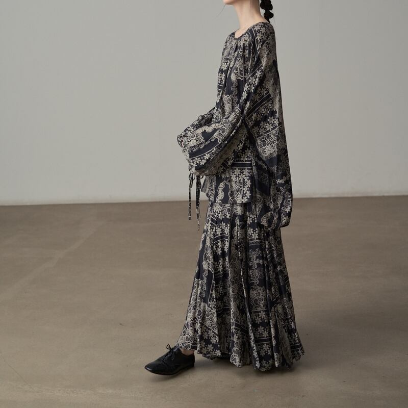 エキゾチックな総柄が目を惹くマキシ丈のフレアスカートです。