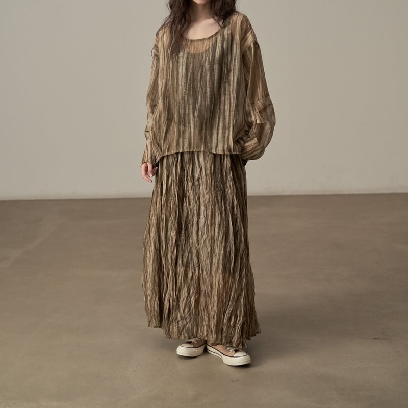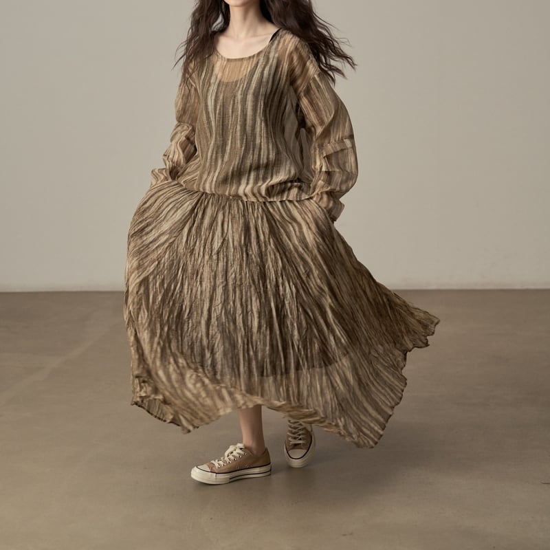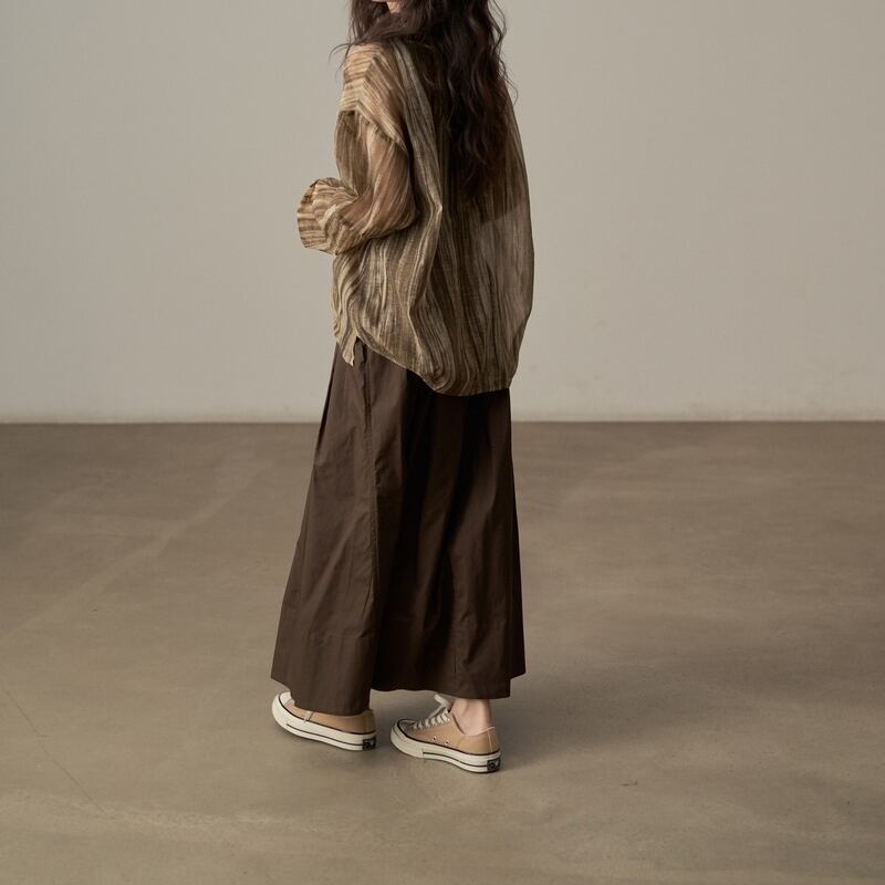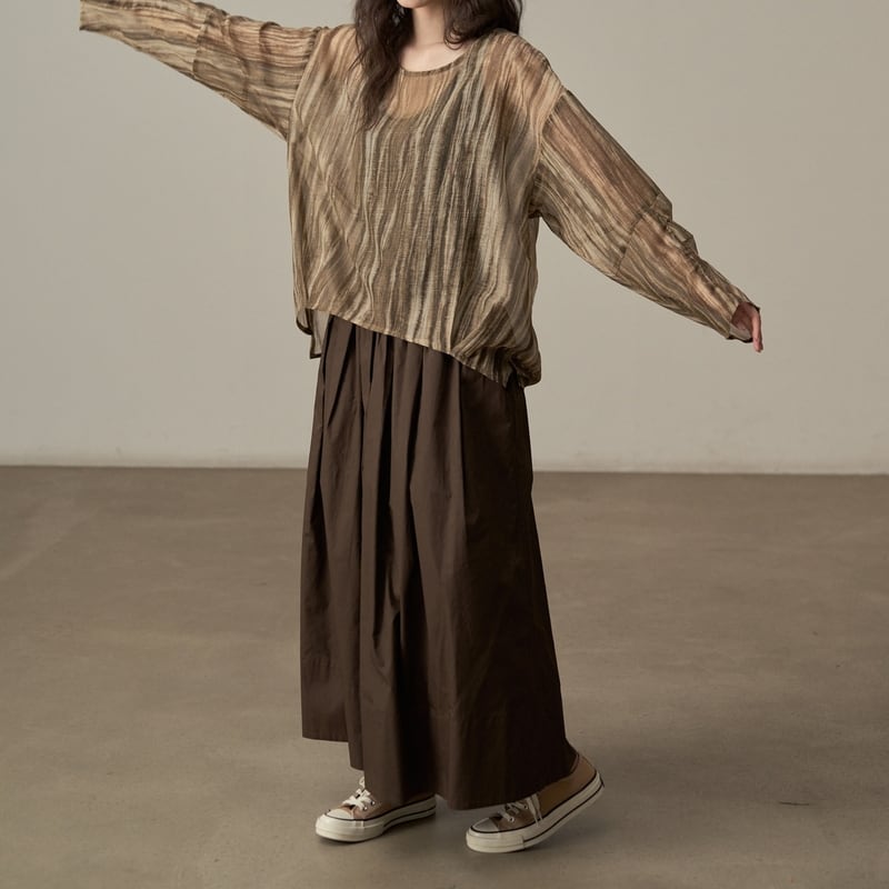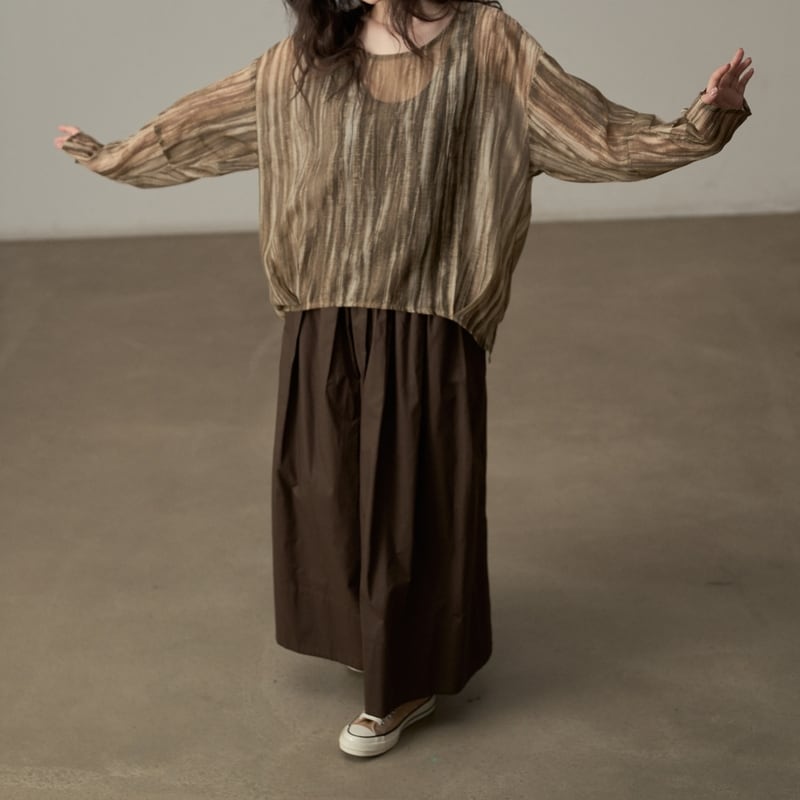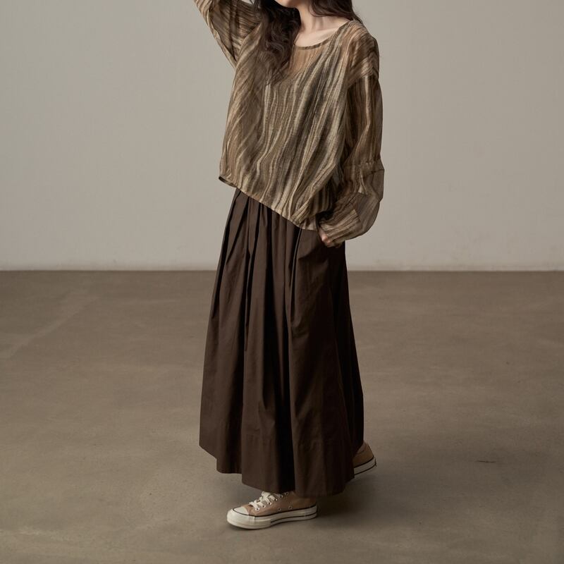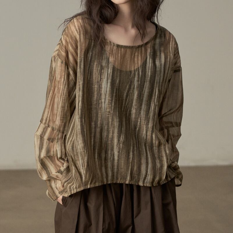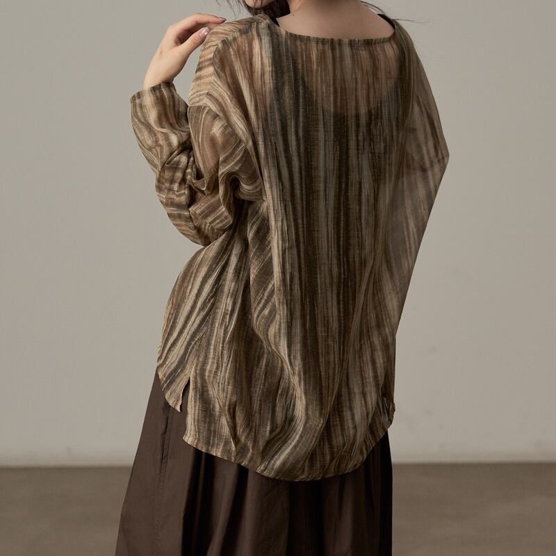 ゆったりとしたシルエットでリラックス感のある、ランダムストライプ柄のシアーブラウスです。
