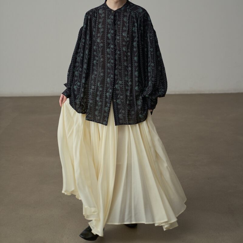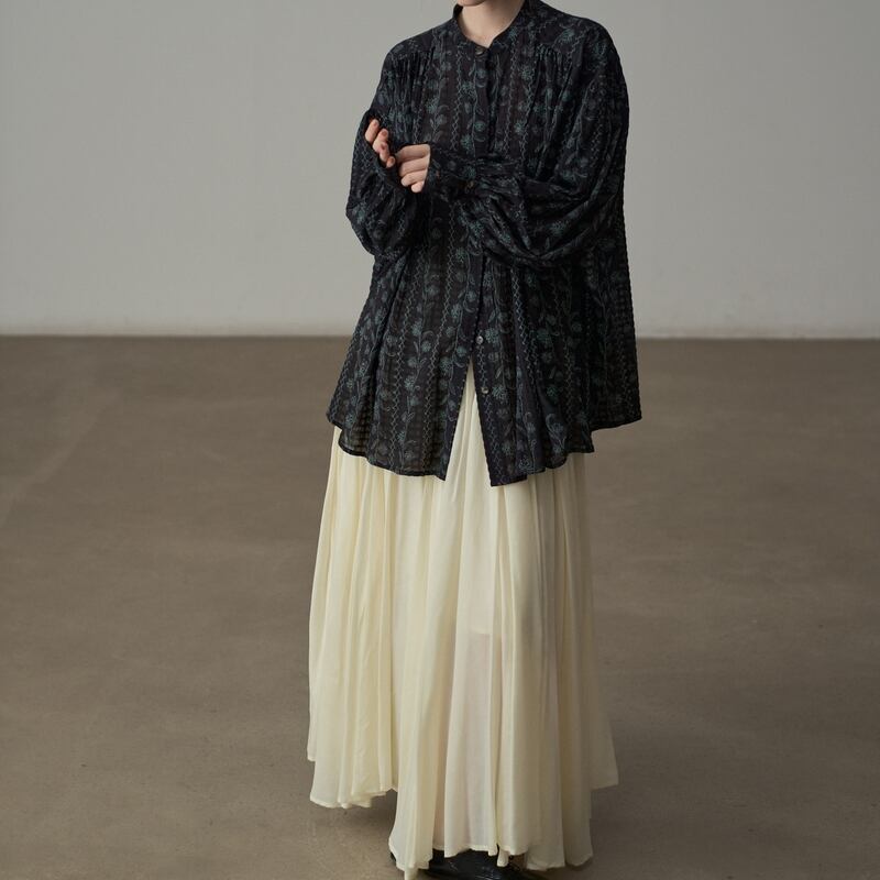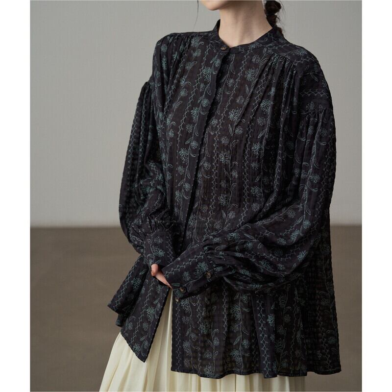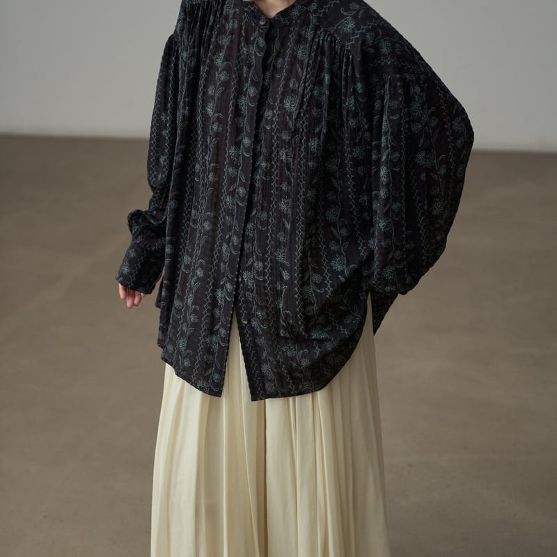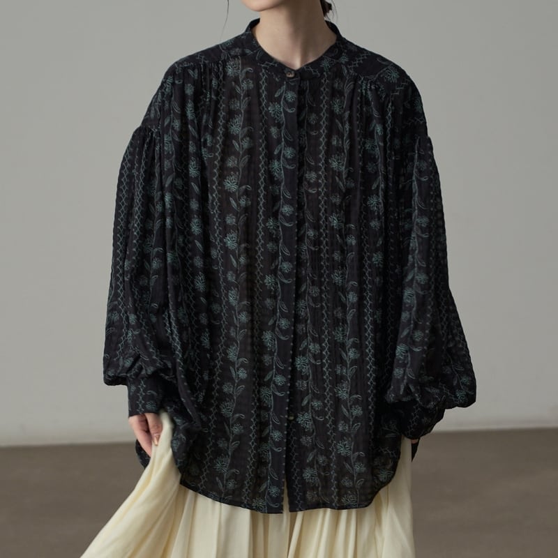 バンドカラーが首元をすっきりと見せてくれるフラワーパターンの長袖シャツです。