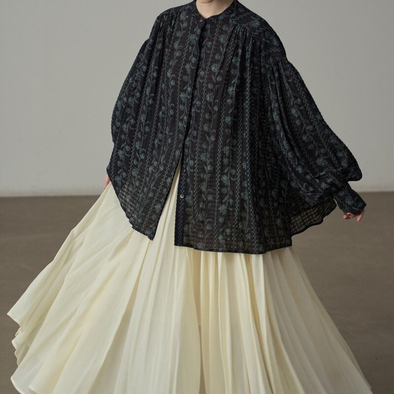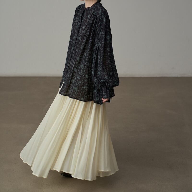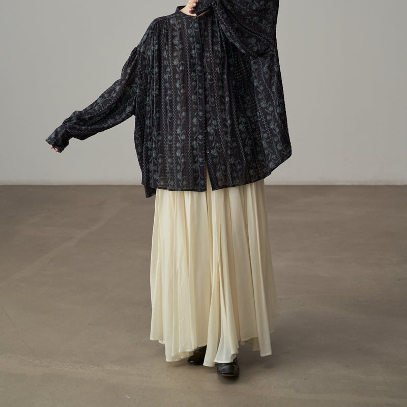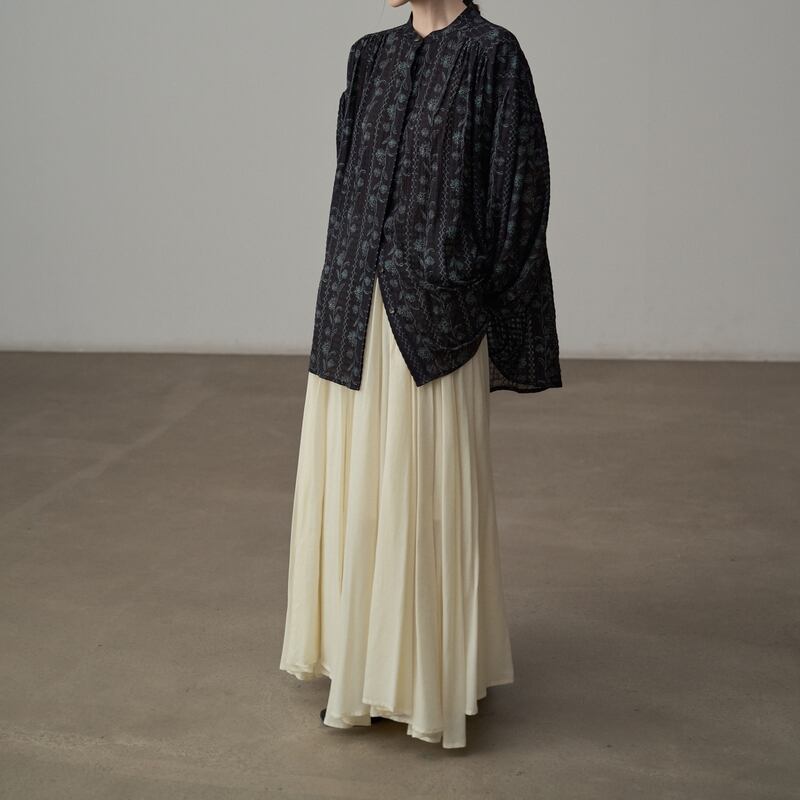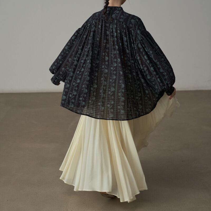 バンドカラーが首元をすっきりと見せてくれるフラワーパターンの長袖シャツです。