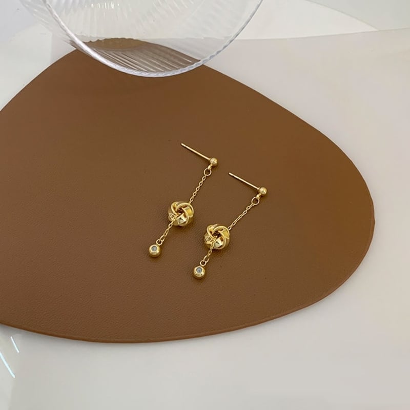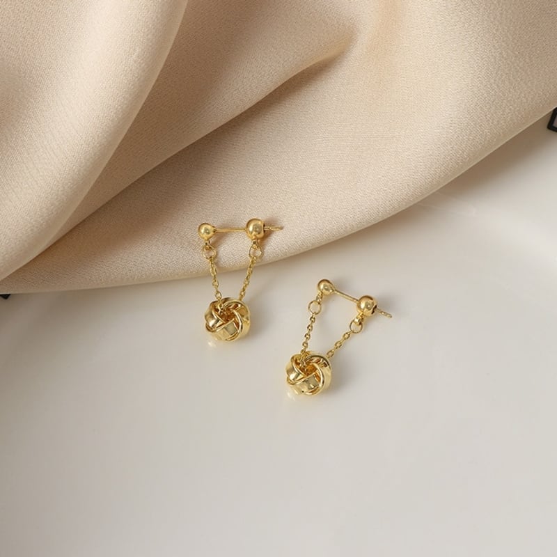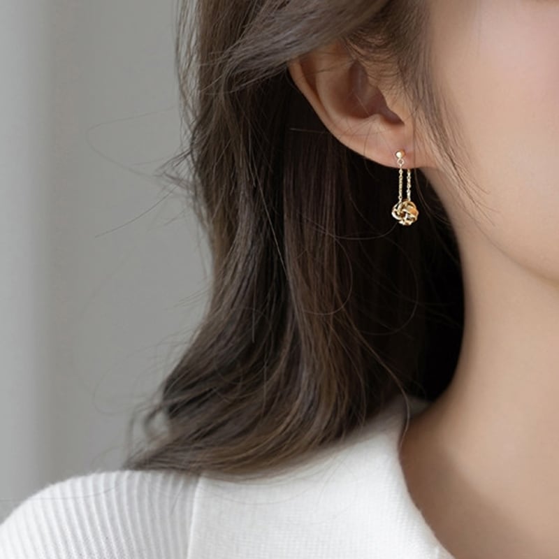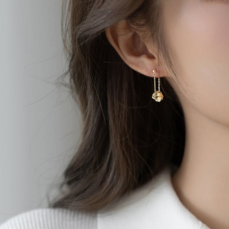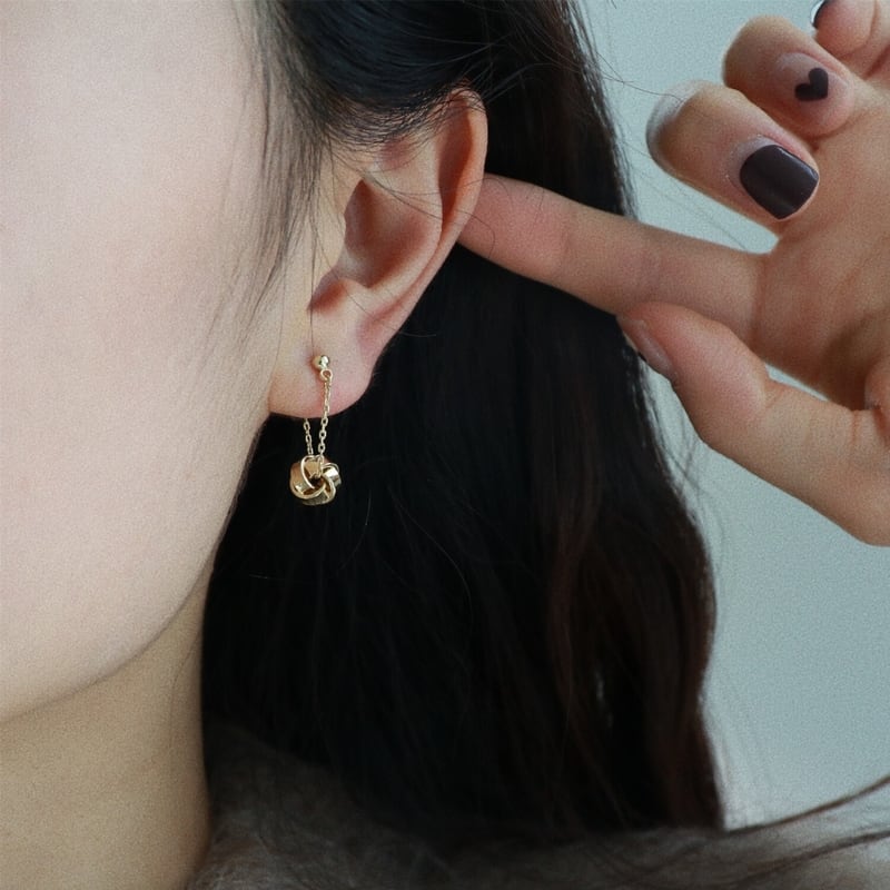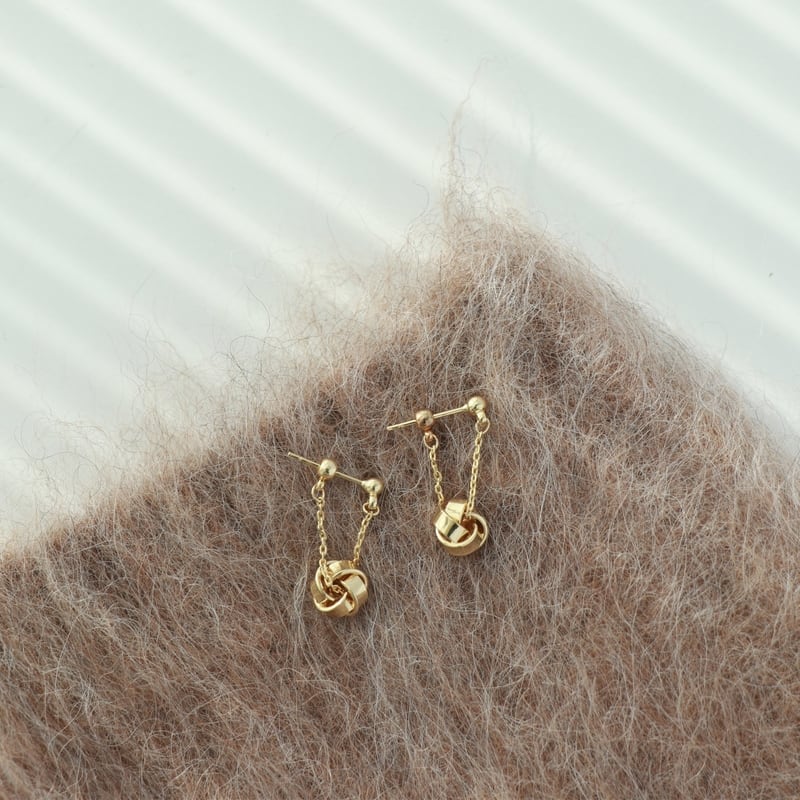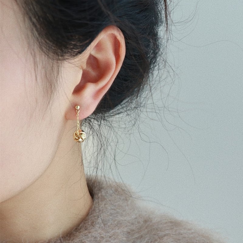 耳元でさりげなく揺れるノットデザインが、女性らしさを引き立てるピアスです。