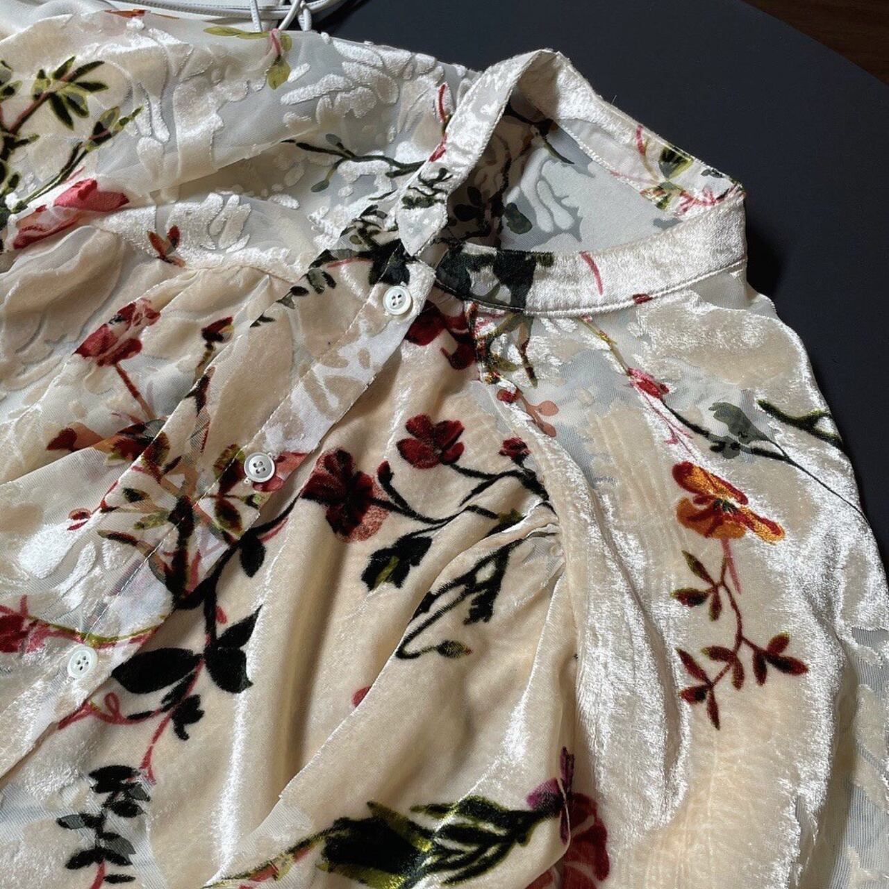 上品なシアーベルベット素材に、繊細な花柄プリントが美しいブラウスです。